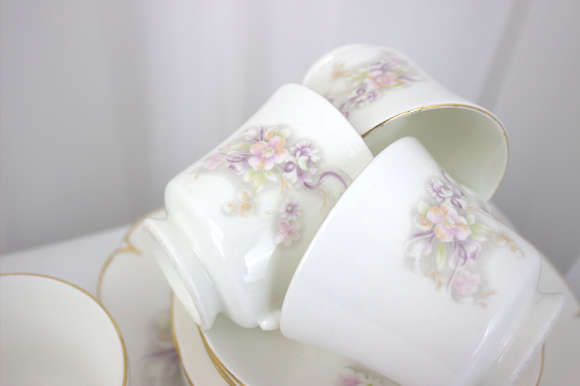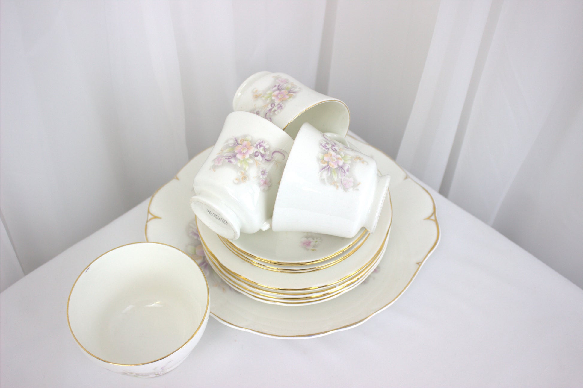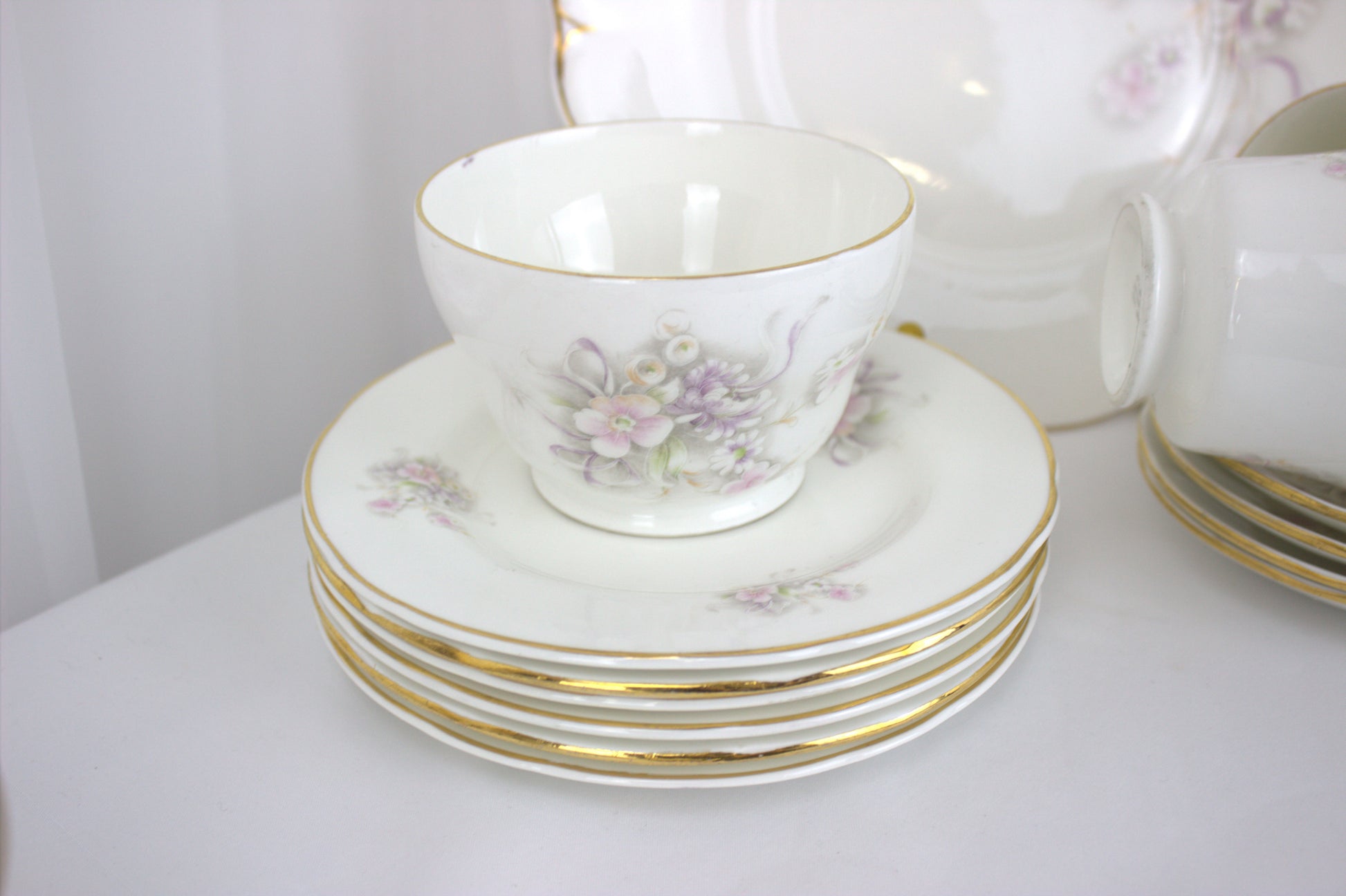 The set features delicate pastel flowers in shades of pink, purple, and green, all beautifully accented with a touch of gold trim. Whether you’re using it to impress guests or simply enjoying a quiet tea break, this set is as versatile as it is charming. Display the pieces as a lovely arrangement, or mix and match them to suit your needs.