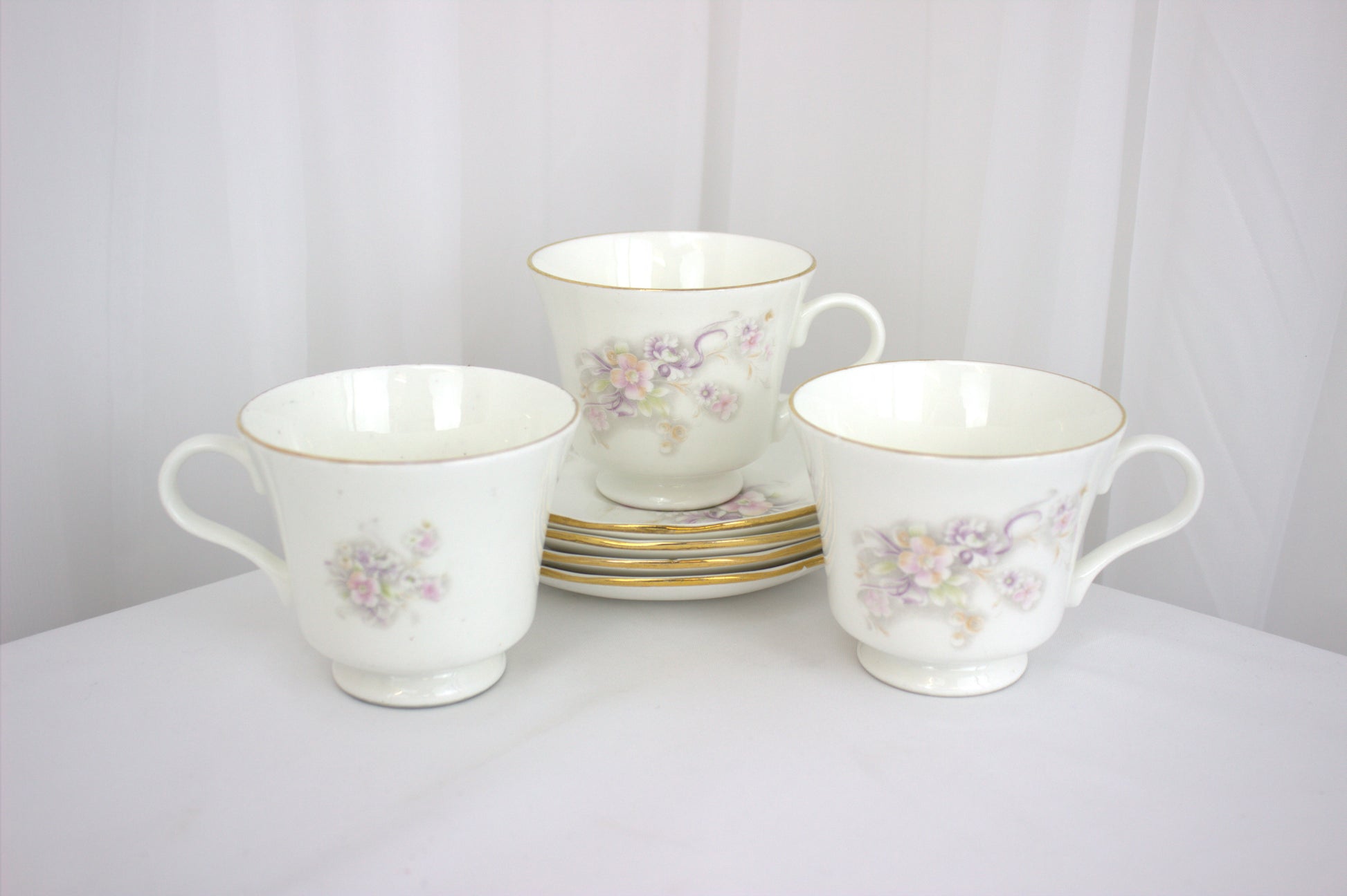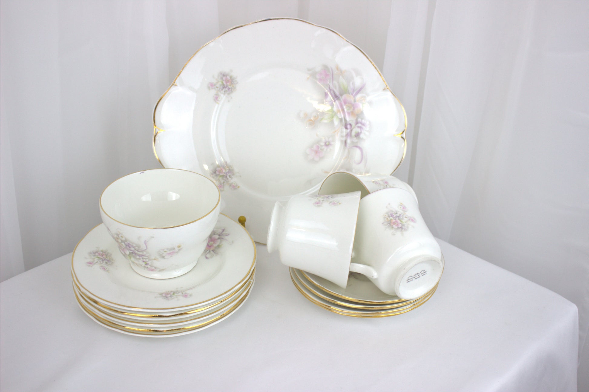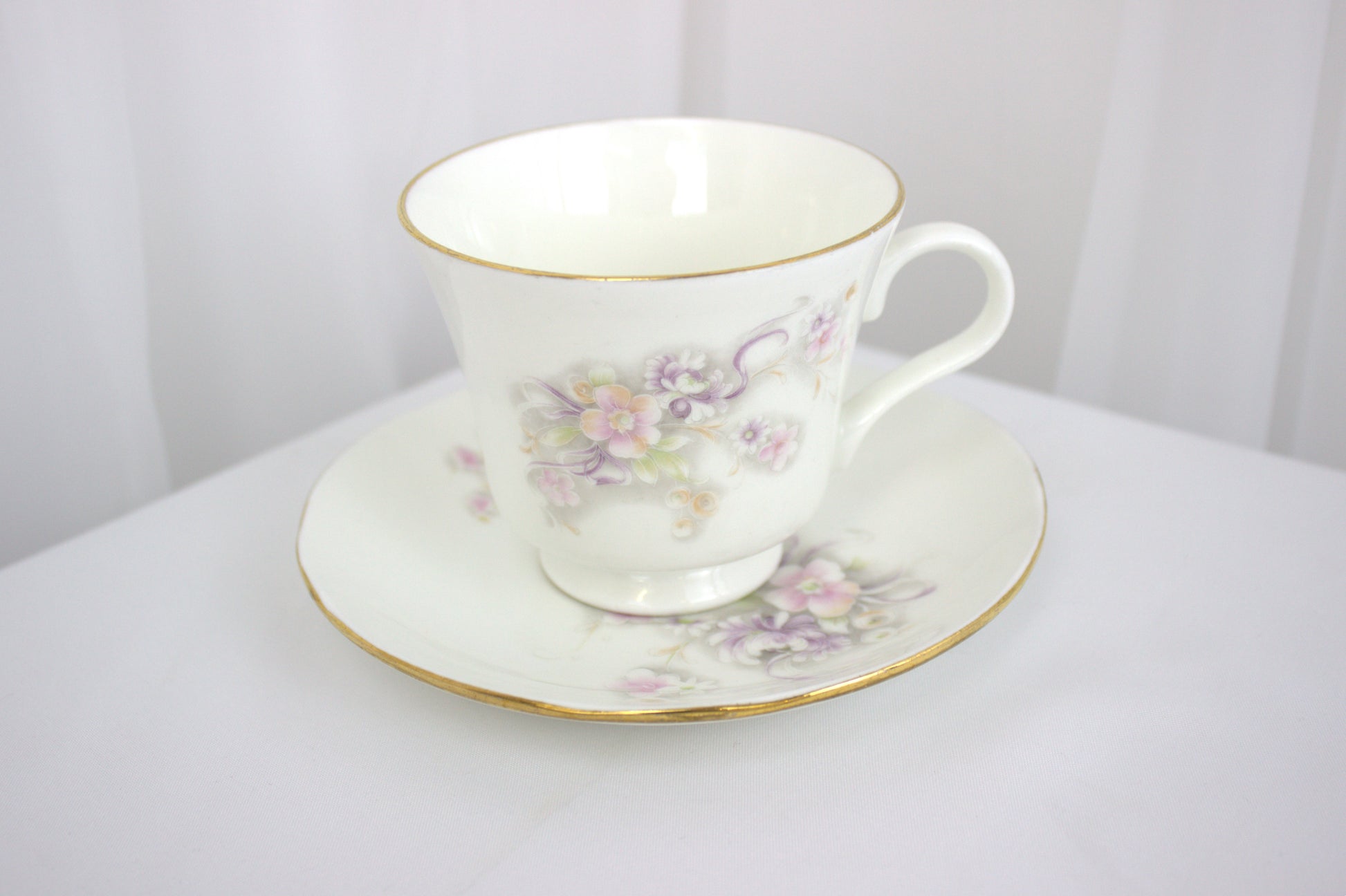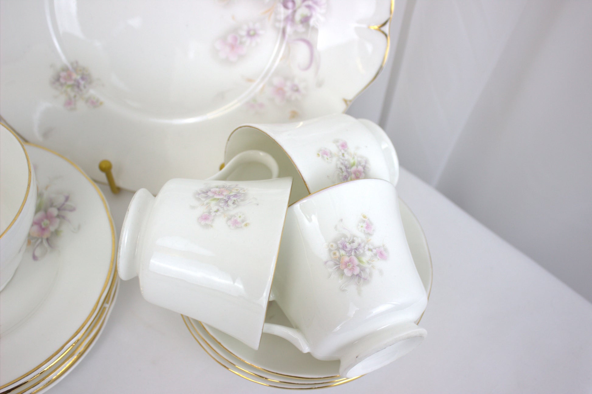 The set features delicate pastel flowers in shades of pink, purple, and green, all beautifully accented with a touch of gold trim. Whether you’re using it to impress guests or simply enjoying a quiet tea break, this set is as versatile as it is charming. Display the pieces as a lovely arrangement, or mix and match them to suit your needs.