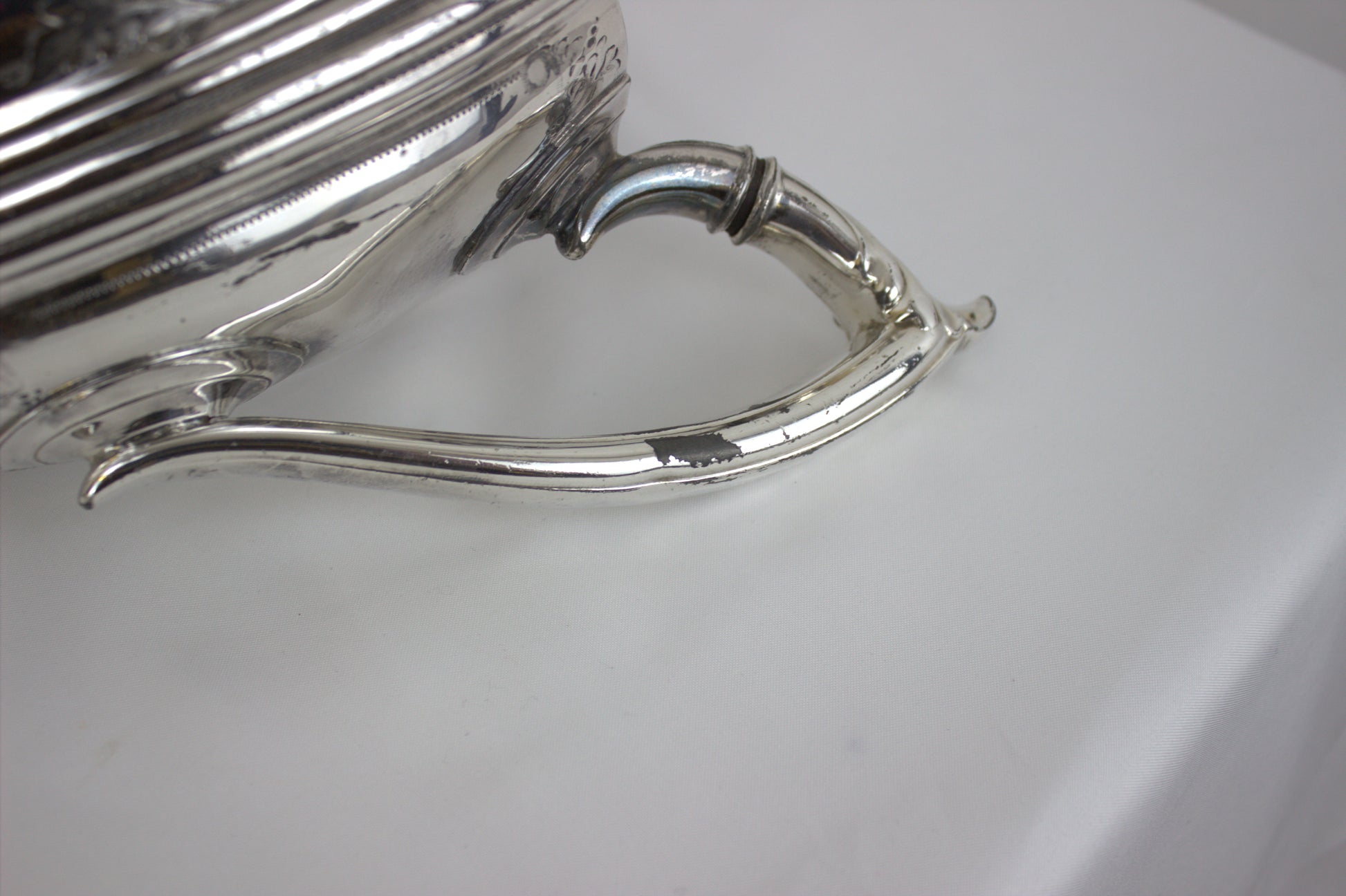 Although one side shows much more wear, the other side still gleams, although still containts flaws, it still makes it a lovely piece for display. The base is stamped with "EPBM" (Electroplated Britannia Metal), a testament to its quality construction, and includes the model number "4652" for collectors who appreciate the finer details of antique silverware.