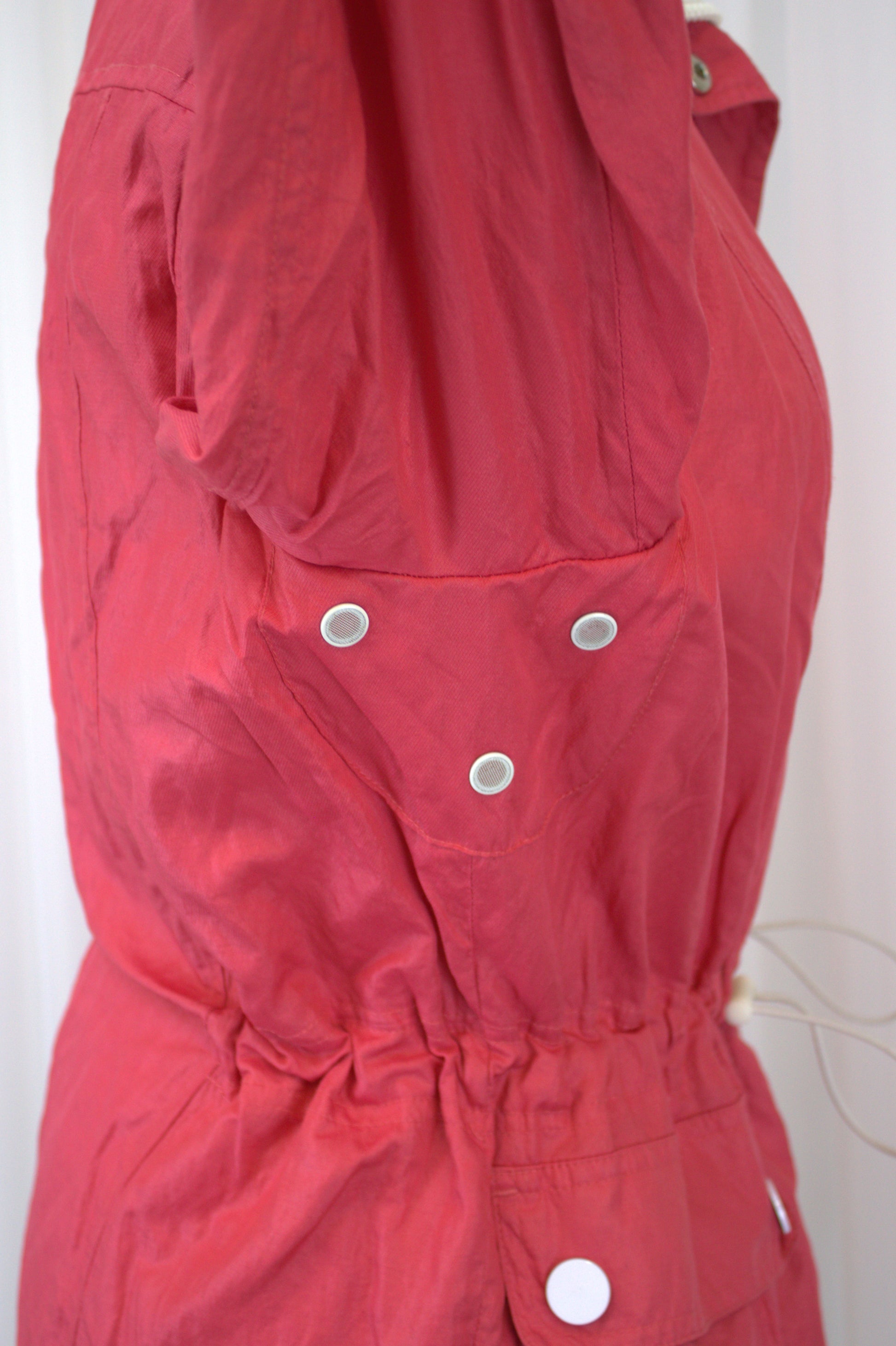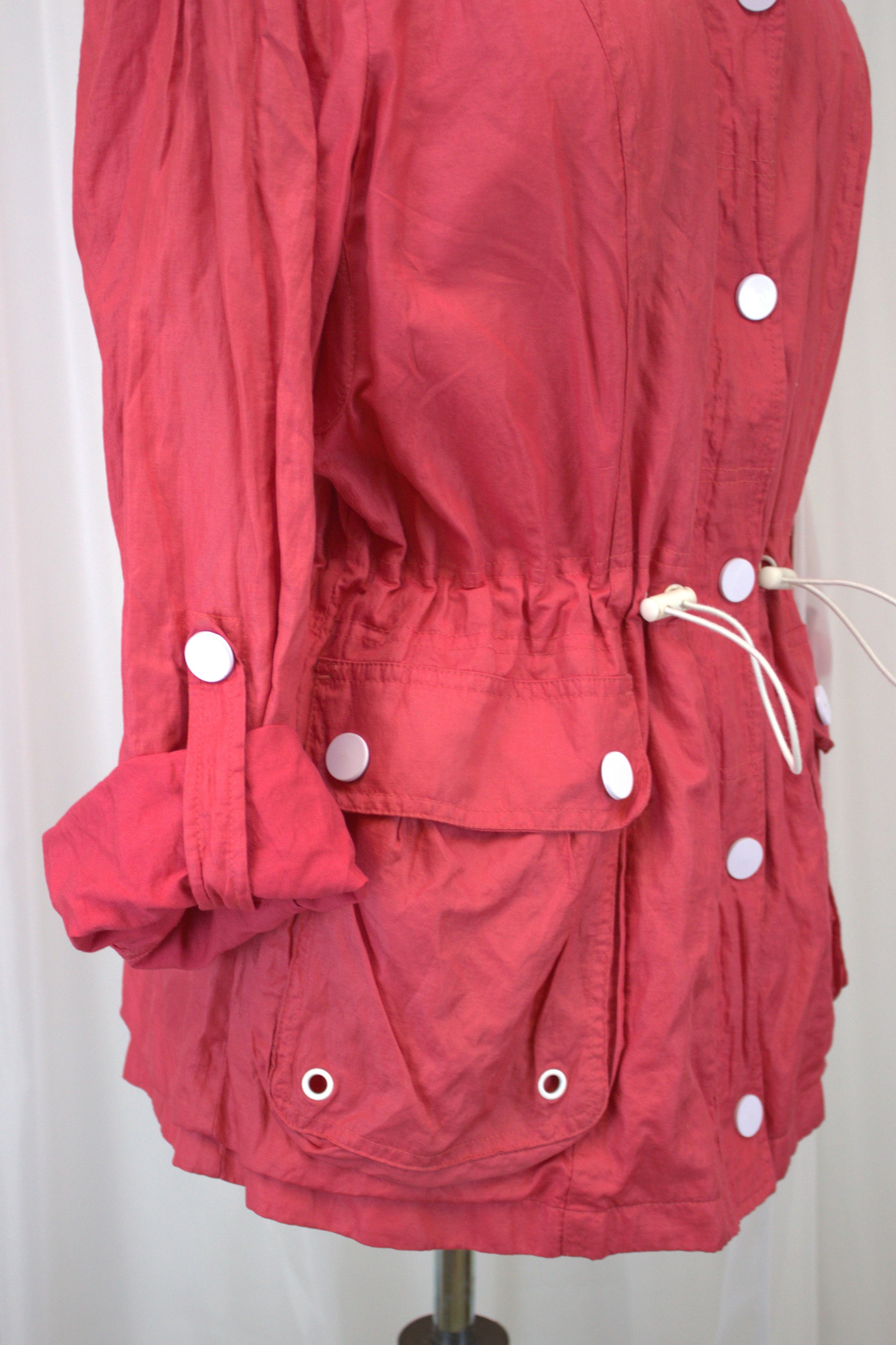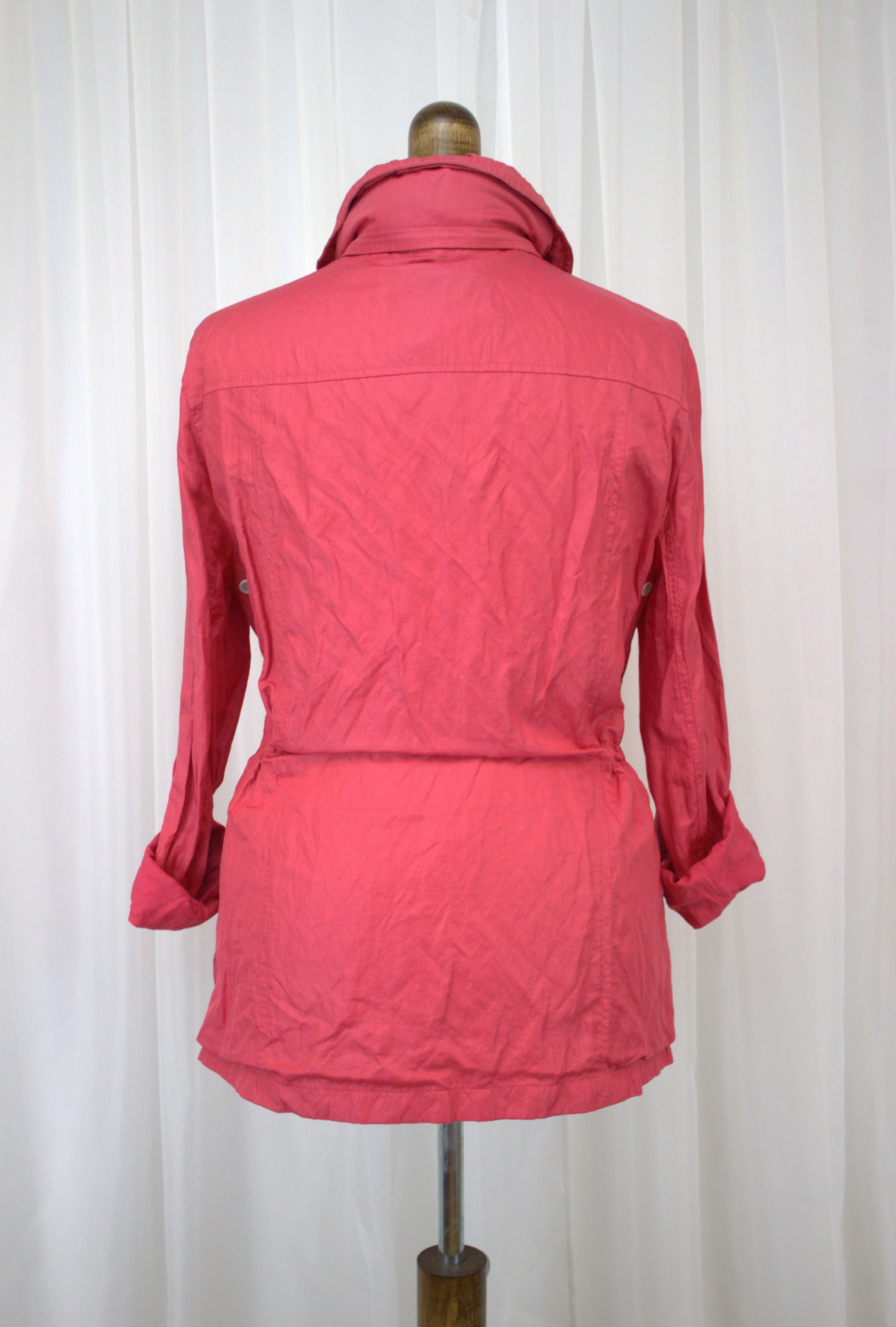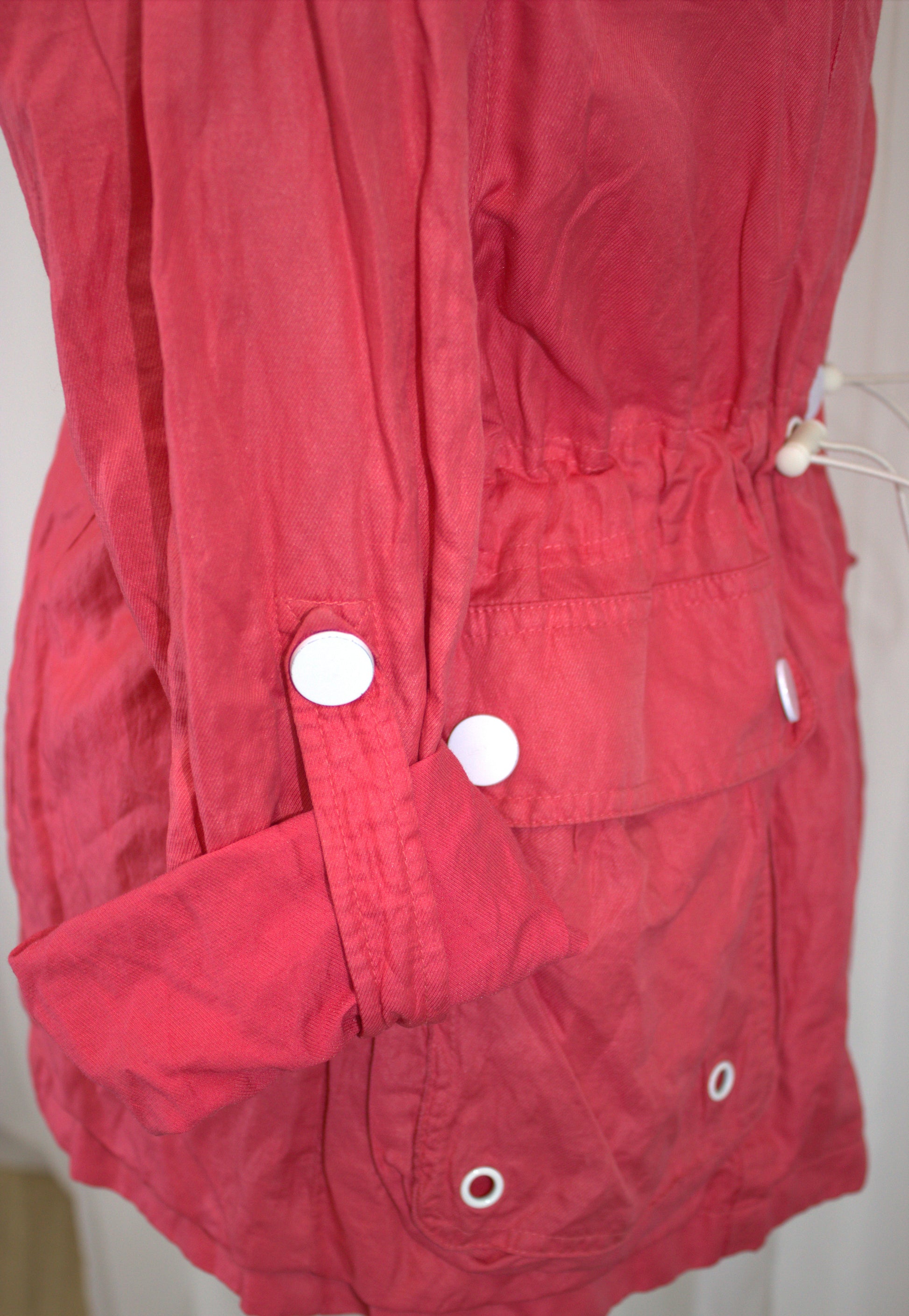 Stay stylish and ready for anything with this vibrant and practical jacket in size 16! The bright, cheerful colour is perfect for adding a pop of fun to your wardrobe, while the hidden hood tucked neatly in the collar with a zip closure makes it great for those unpredictable weather days. The adjustable drawstring waist lets you cinch it in for a flattering fit, and the cuffs can be rolled up and secured with button details for a more casual look.