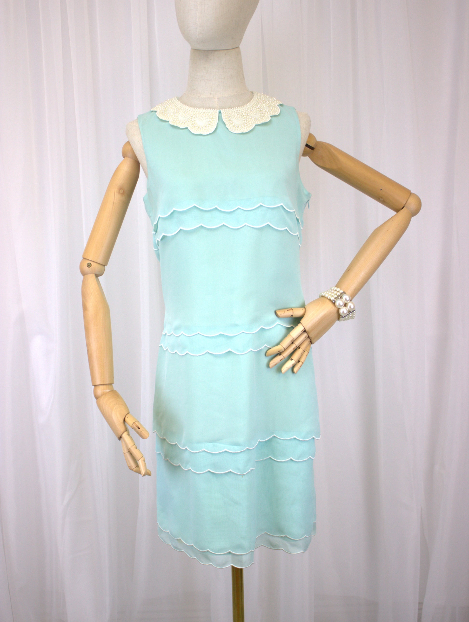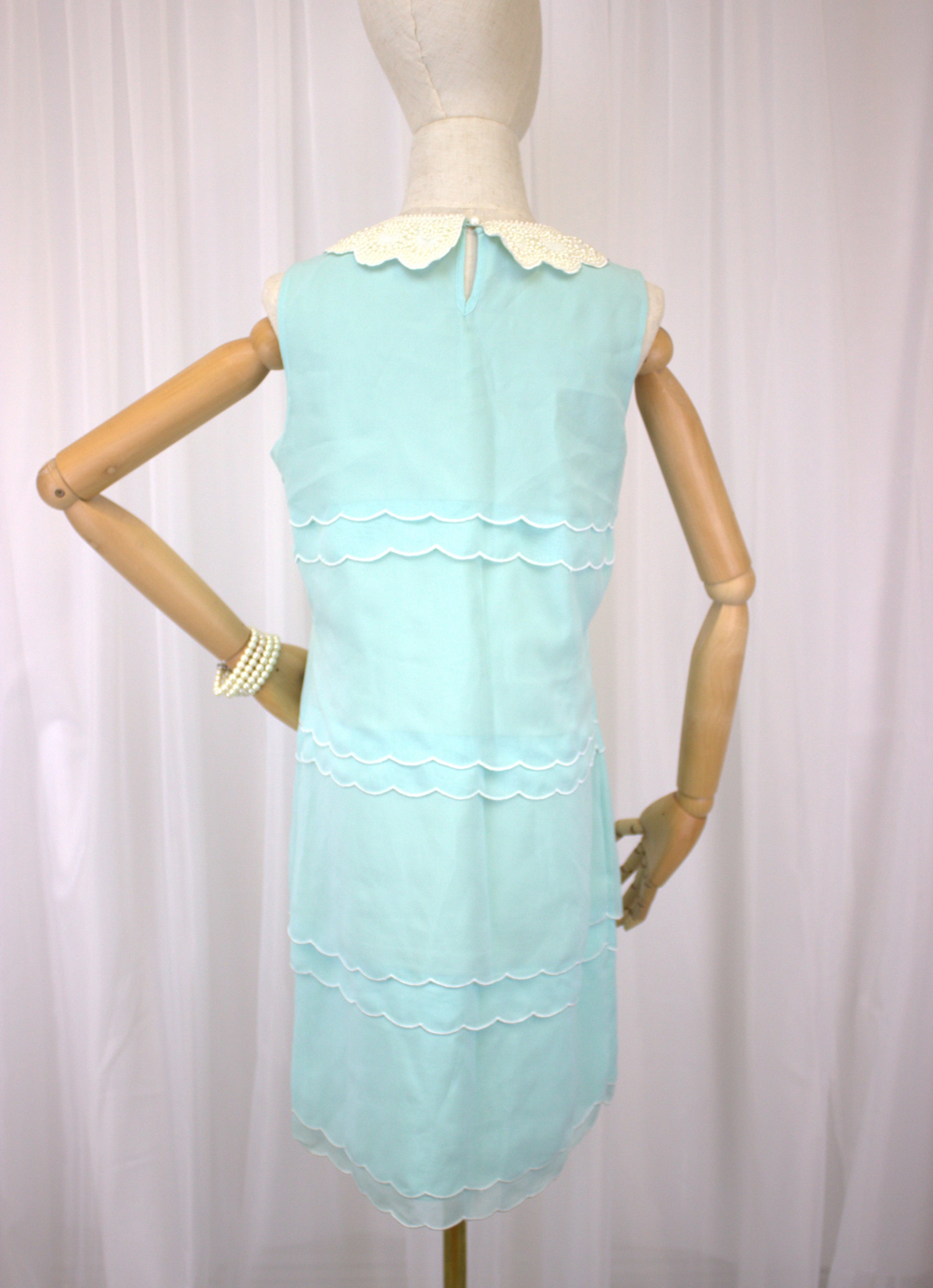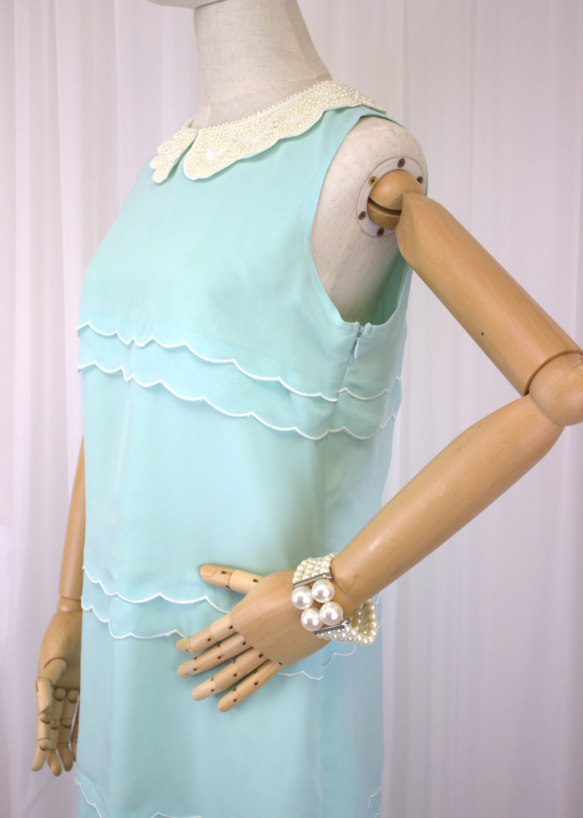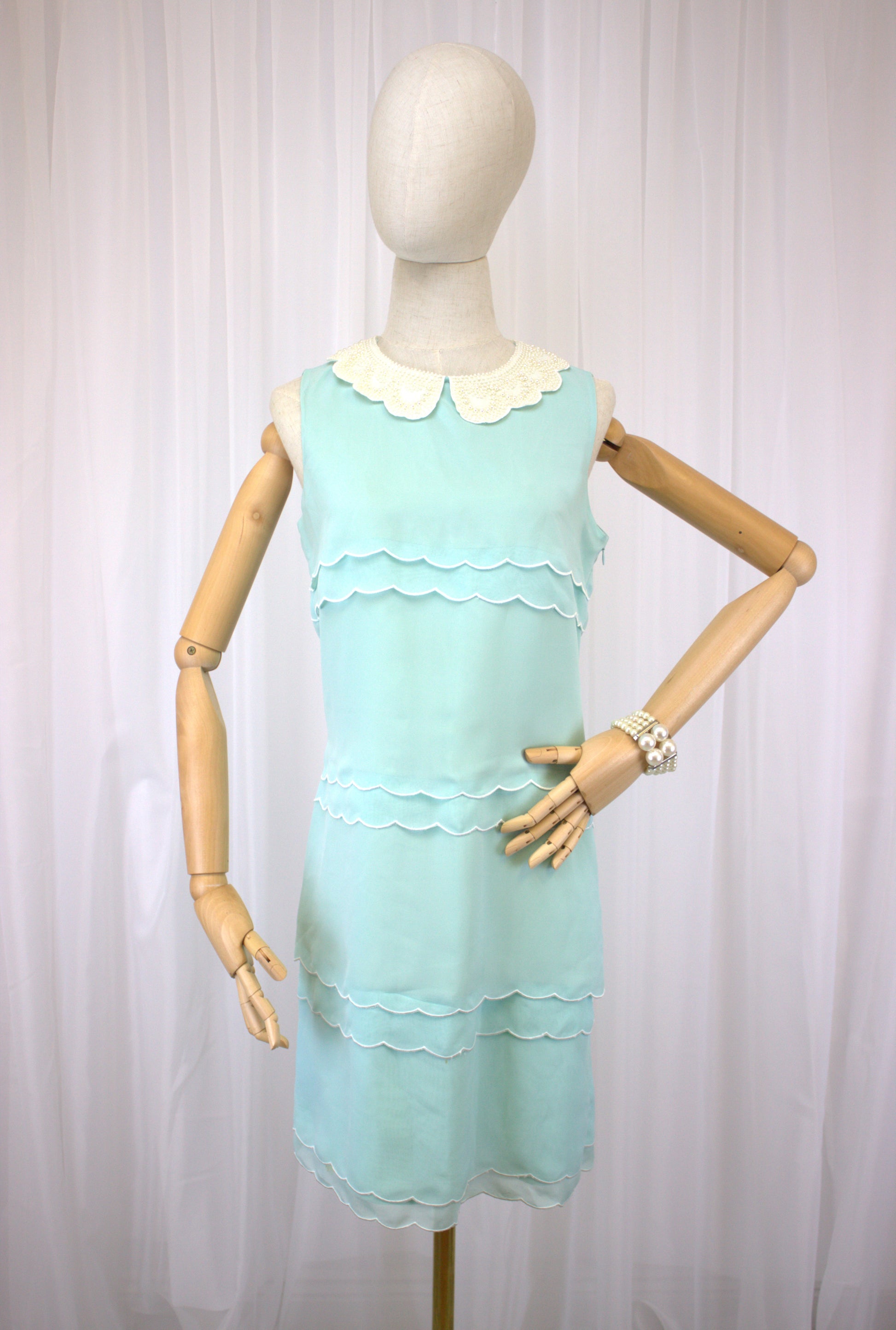 Step into elegance with this enchanting mint green chiffon shift dress. Its delicate, floaty fabric and whimsical scalloped tiered details create a graceful and elegant silhouette. The dress features a stunning pearl collar and a size zipper at the back to help shape and flatter any figure, along with a small, dainty button to fasten the collar. This timeless piece, in a beautifully neutral mint green, is a vintage treasure that will add a touch of classic charm to your wardrobe. Perfect for any occasion, this size 10 dress is a must-have for those who adore sophisticated and playful fashion.