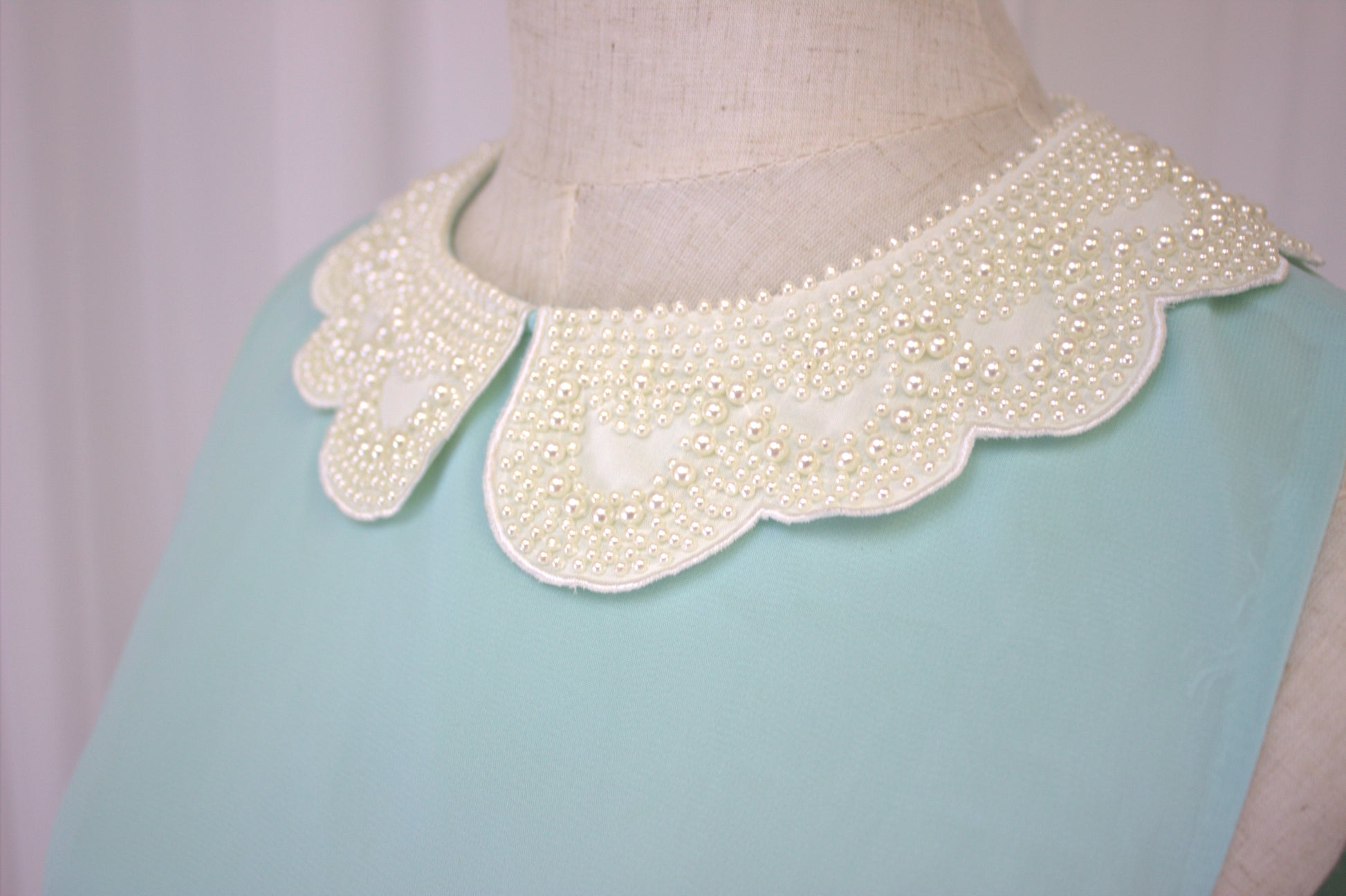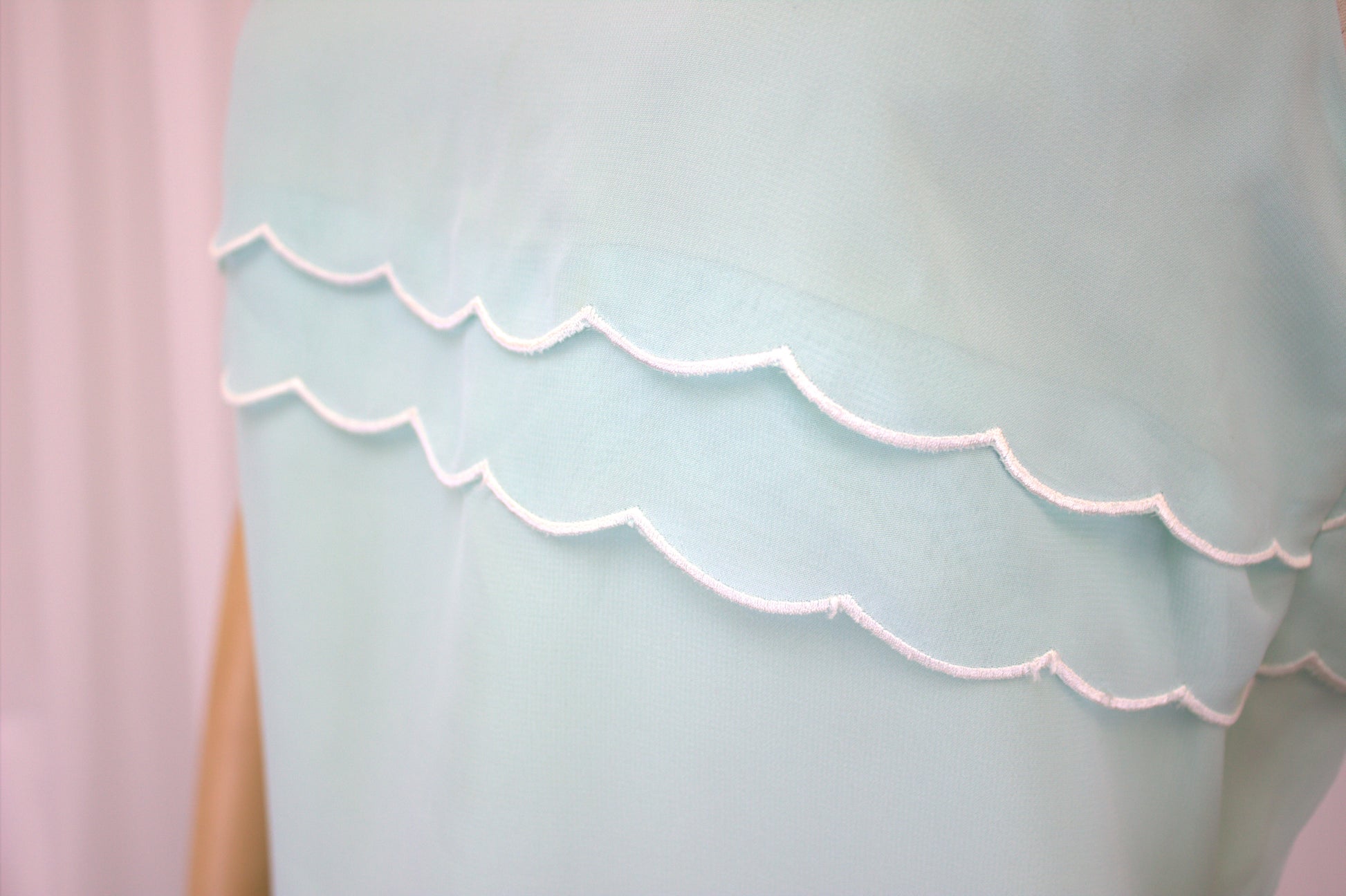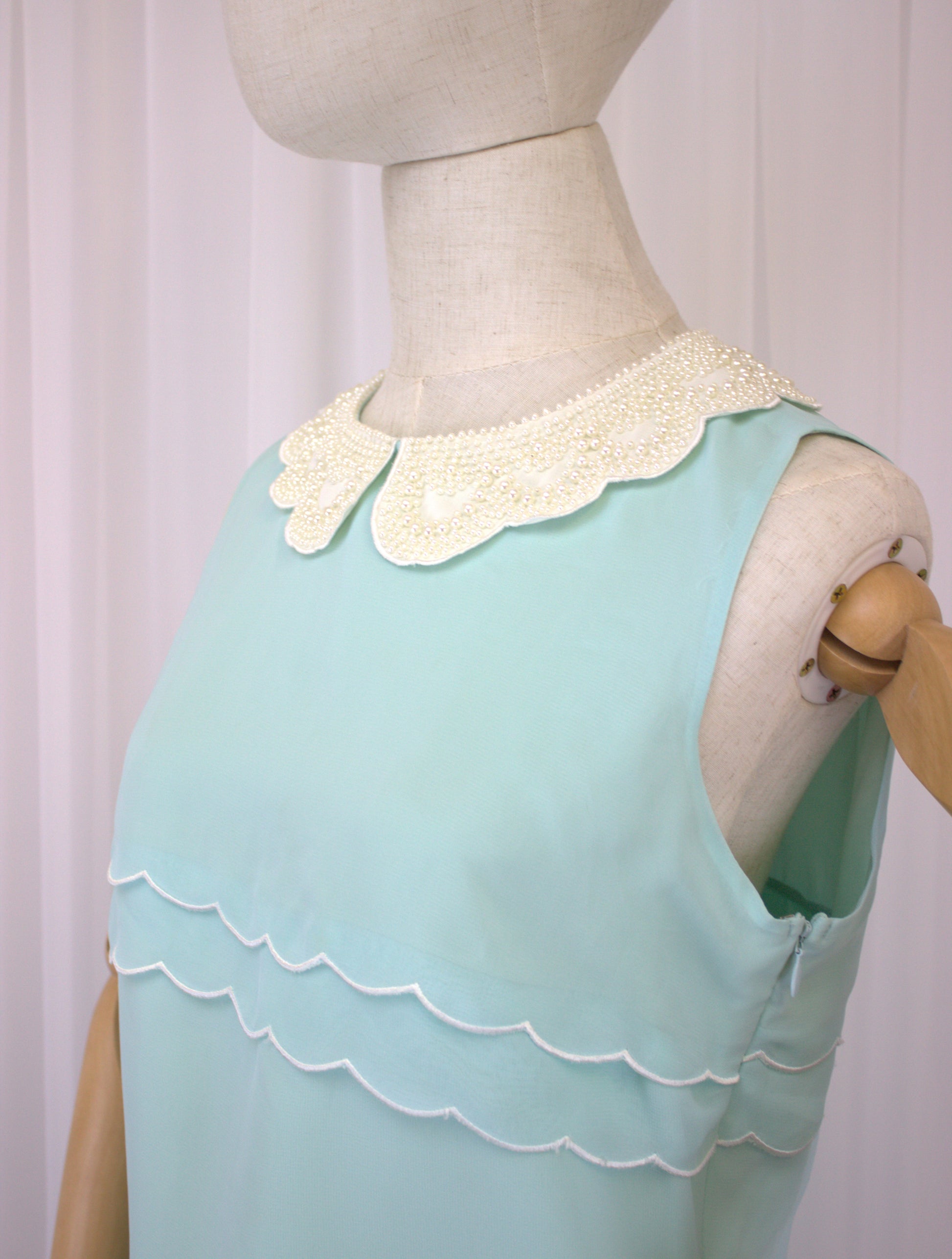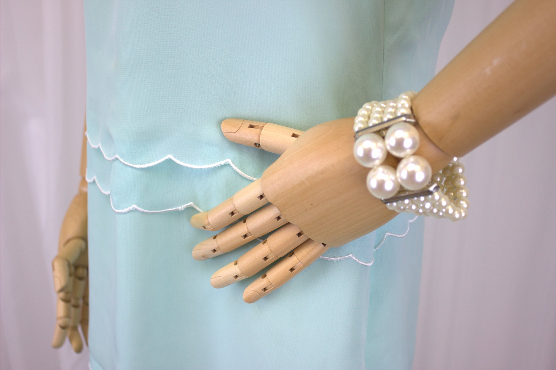Step into elegance with this enchanting mint green chiffon shift dress. Its delicate, floaty fabric and whimsical scalloped tiered details create a graceful and elegant silhouette. The dress features a stunning pearl collar and a size zipper at the back to help shape and flatter any figure, along with a small, dainty button to fasten the collar. This timeless piece, in a beautifully neutral mint green, is a vintage treasure that will add a touch of classic charm to your wardrobe. Perfect for any occasion, this size 10 dress is a must-have for those who adore sophisticated and playful fashion.