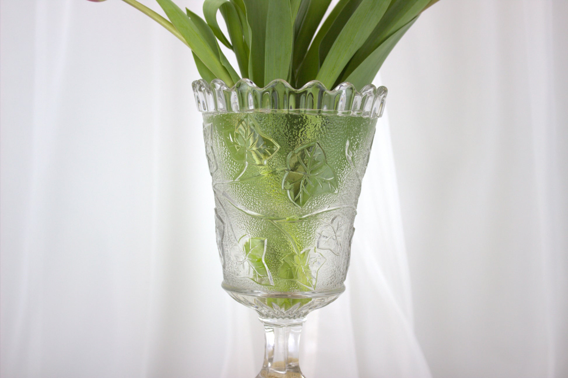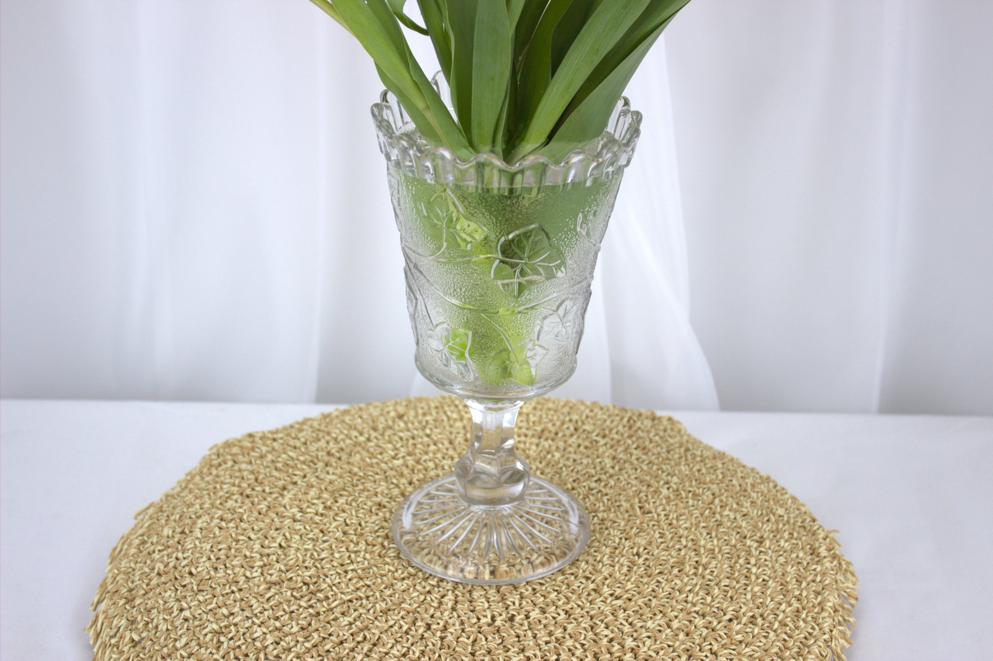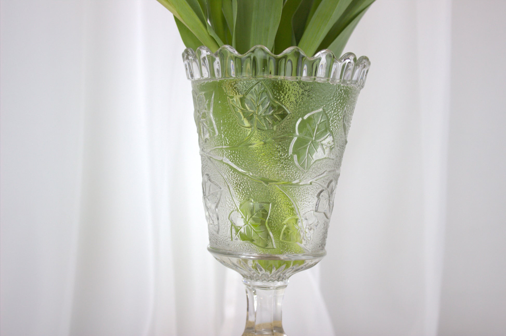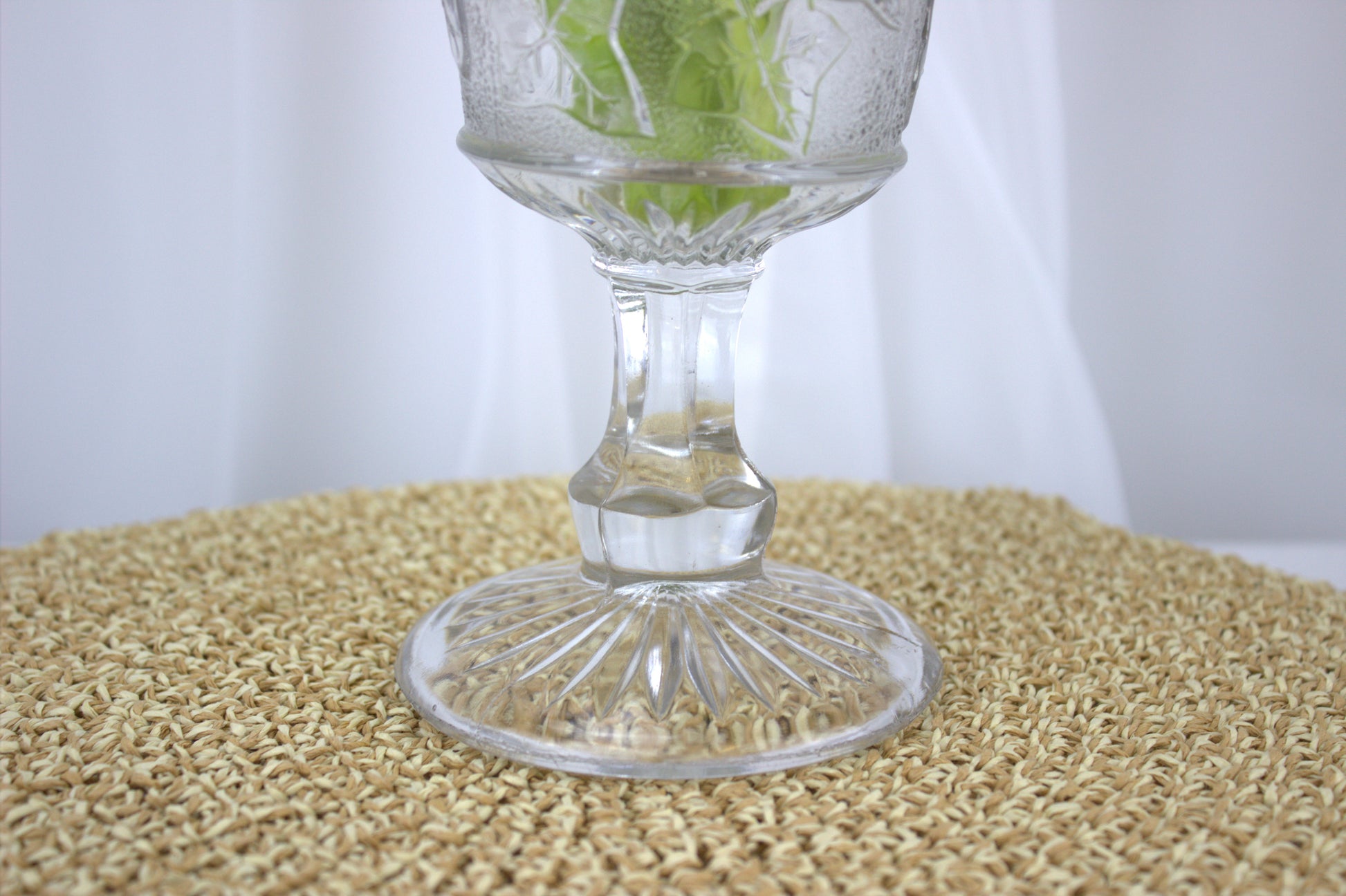 Picture it gracing your table, adding a touch of elegance and history to your home decor. Made of pressed glass, it boasts intricate ivy shoot decorations and a classic star base. Standing tall at 21 cm with a diameter of 12 cm, it's the perfect conversation starter for any vintage enthusiast. Whether you're a collector or just love unique finds, this piece is sure to steal the spotlight!