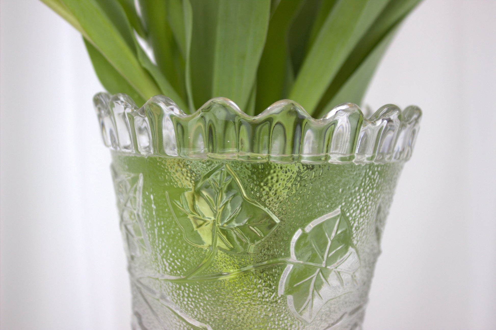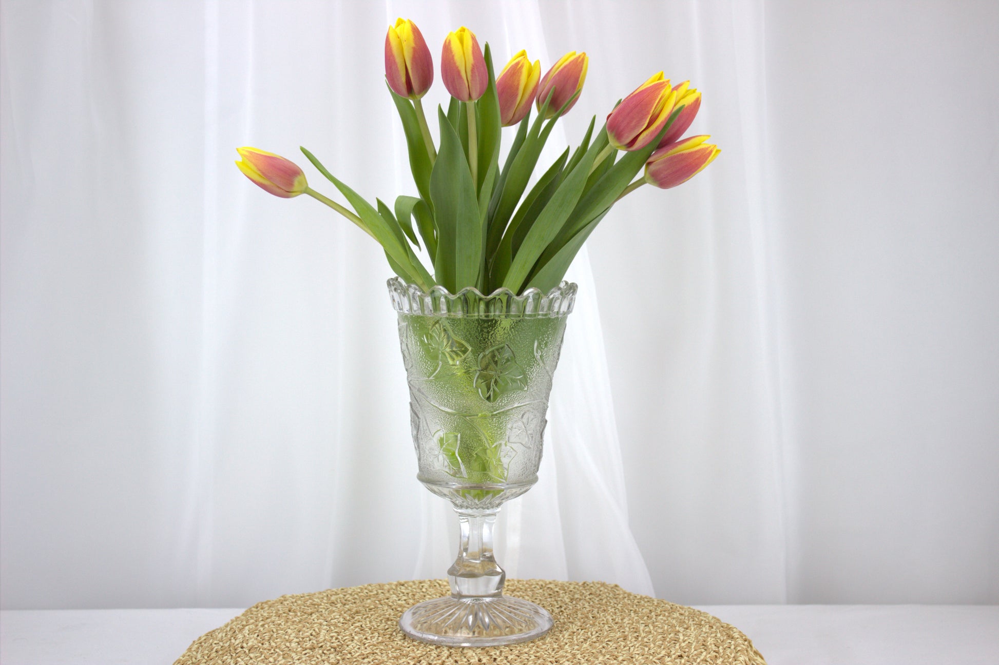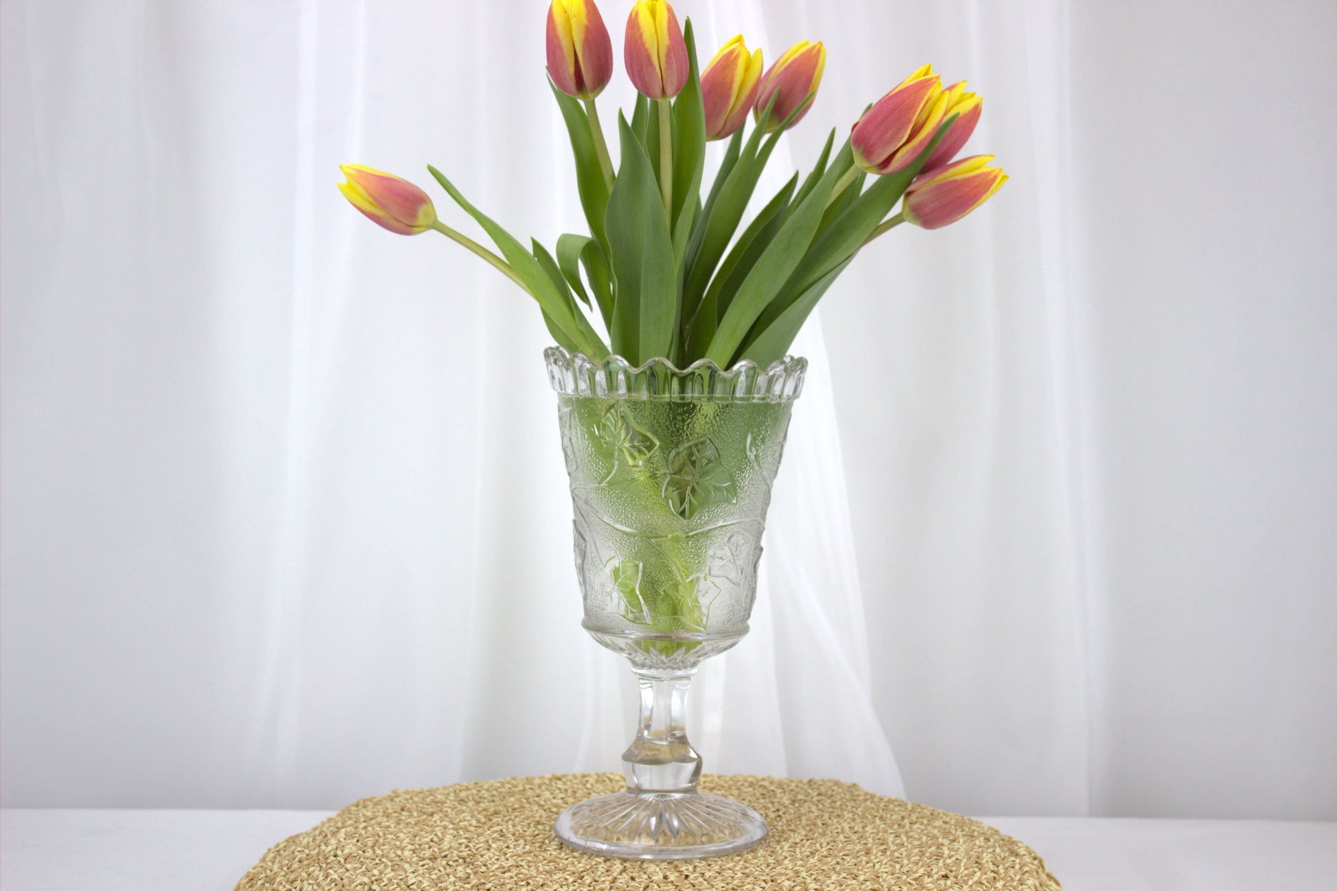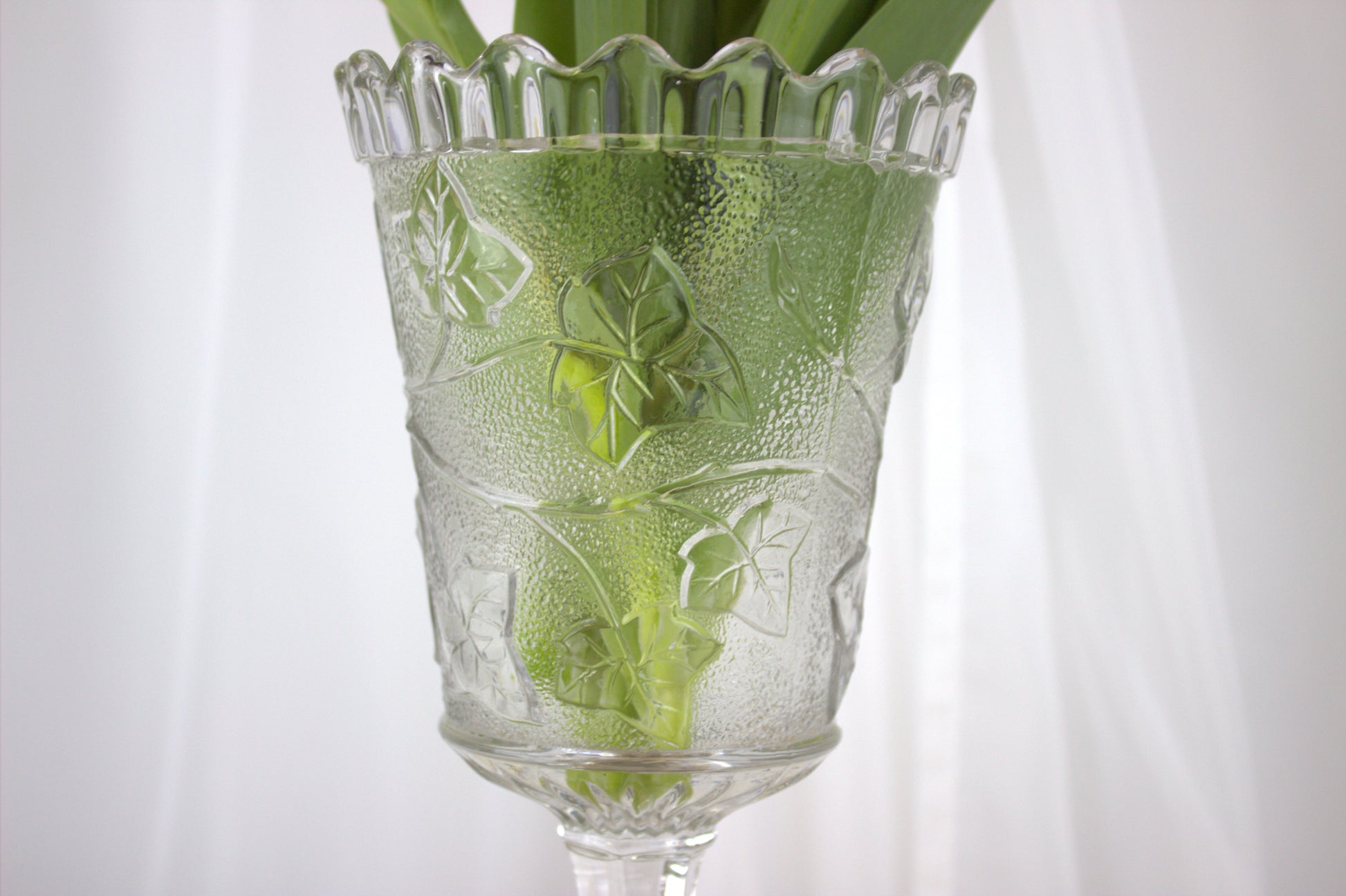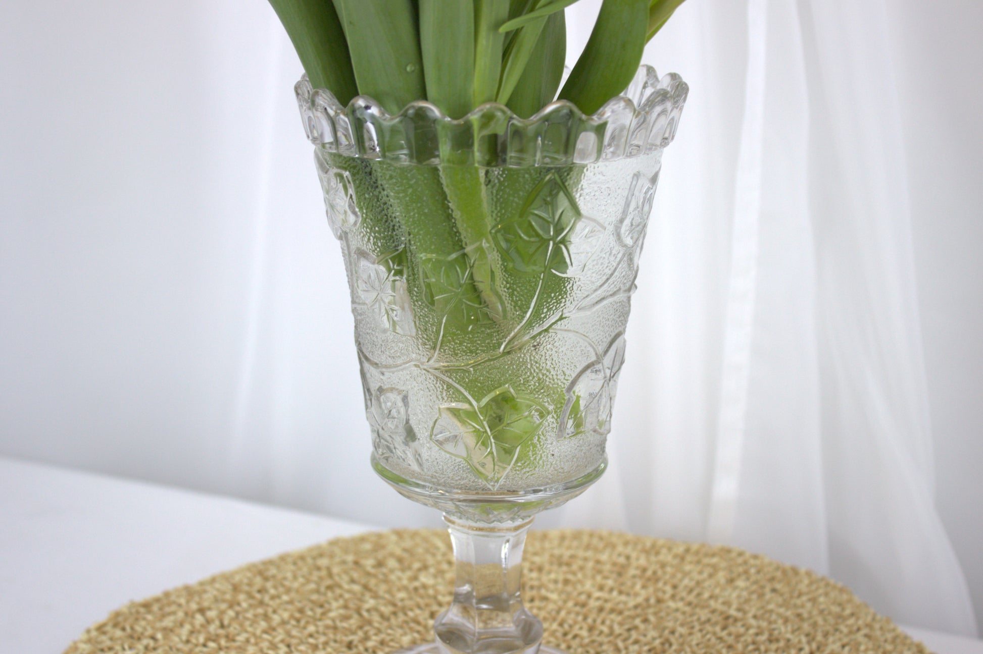 Picture it gracing your table, adding a touch of elegance and history to your home decor. Made of pressed glass, it boasts intricate ivy shoot decorations and a classic star base. Standing tall at 21 cm with a diameter of 12 cm, it's the perfect conversation starter for any vintage enthusiast. Whether you're a collector or just love unique finds, this piece is sure to steal the spotlight!