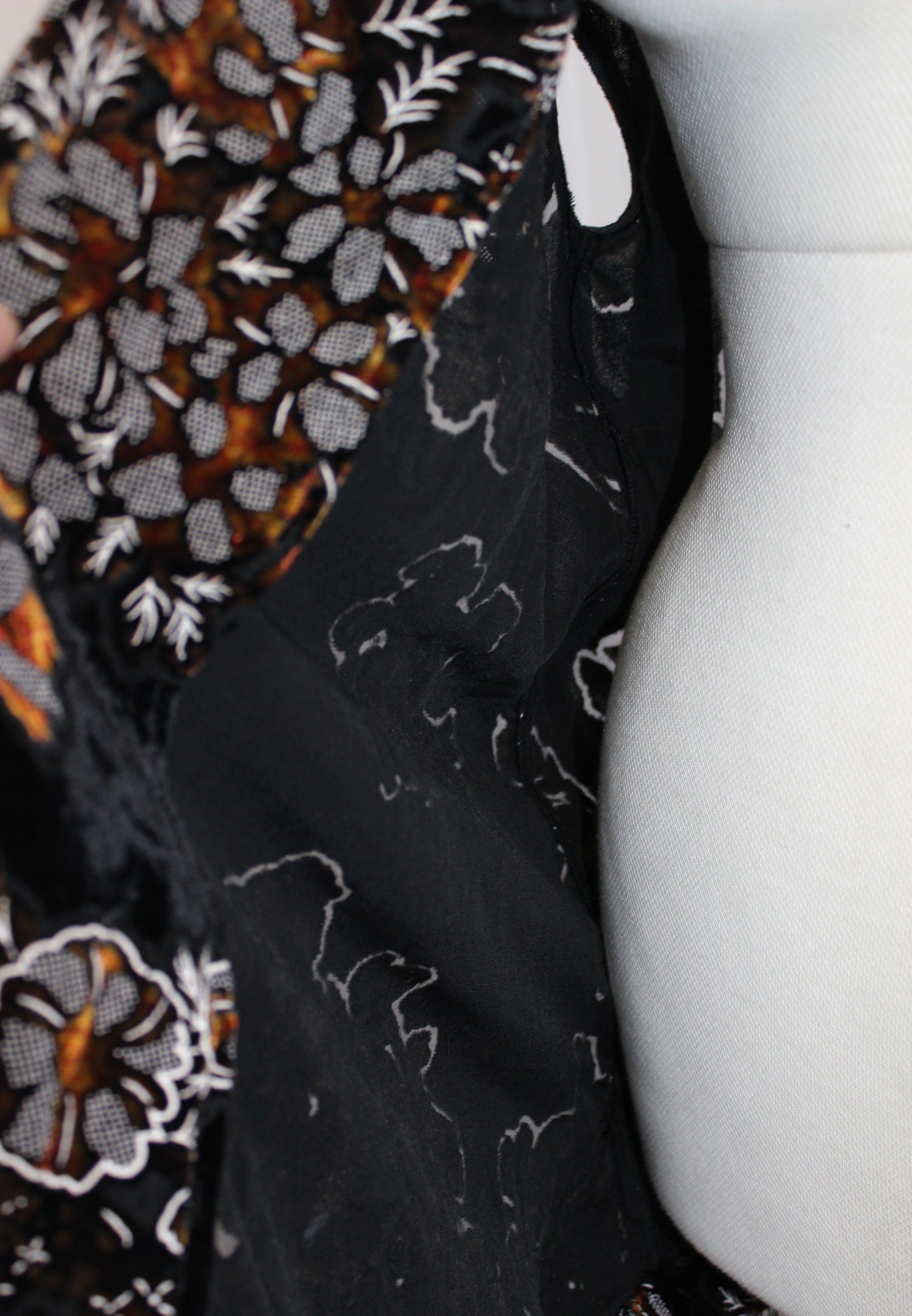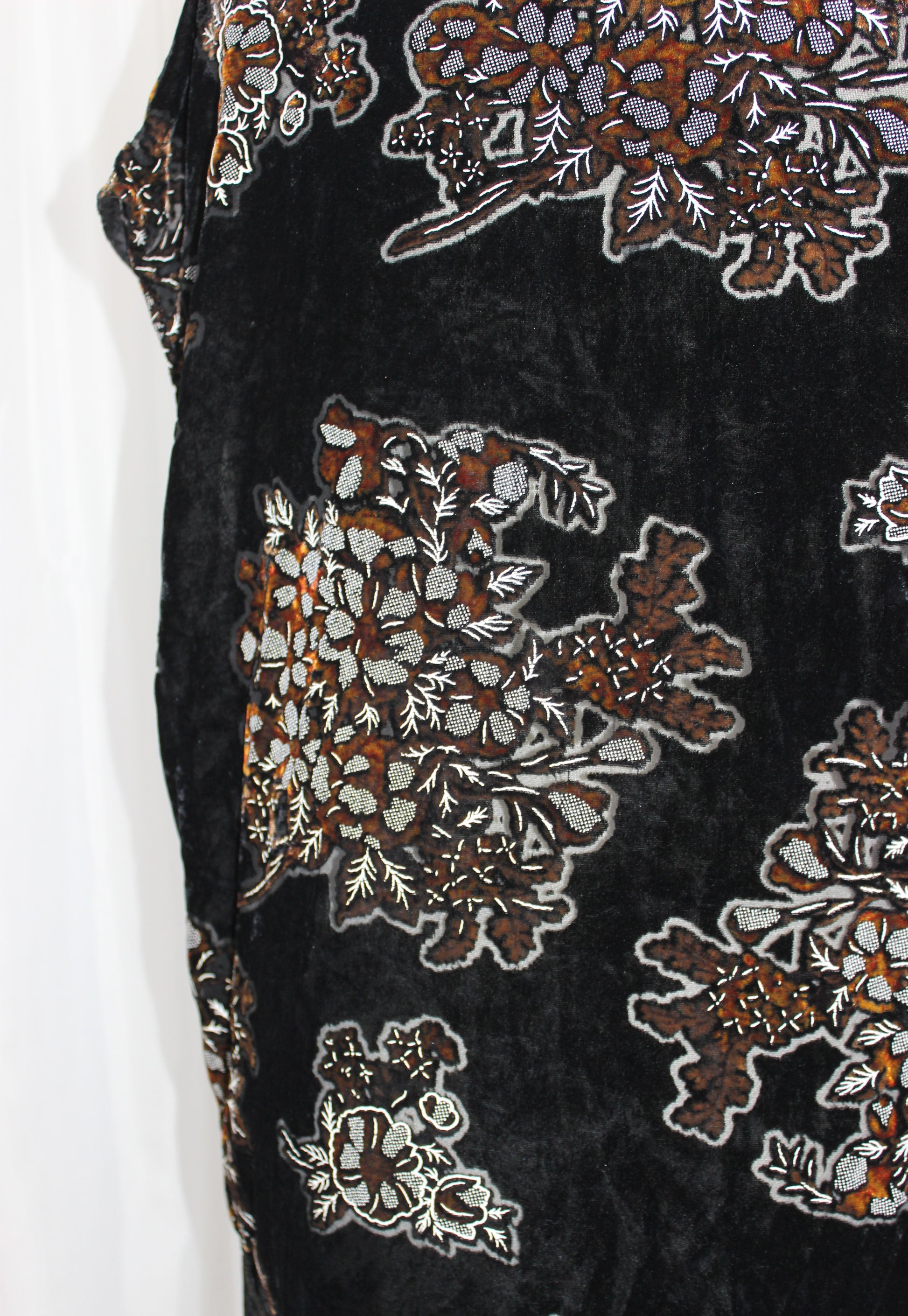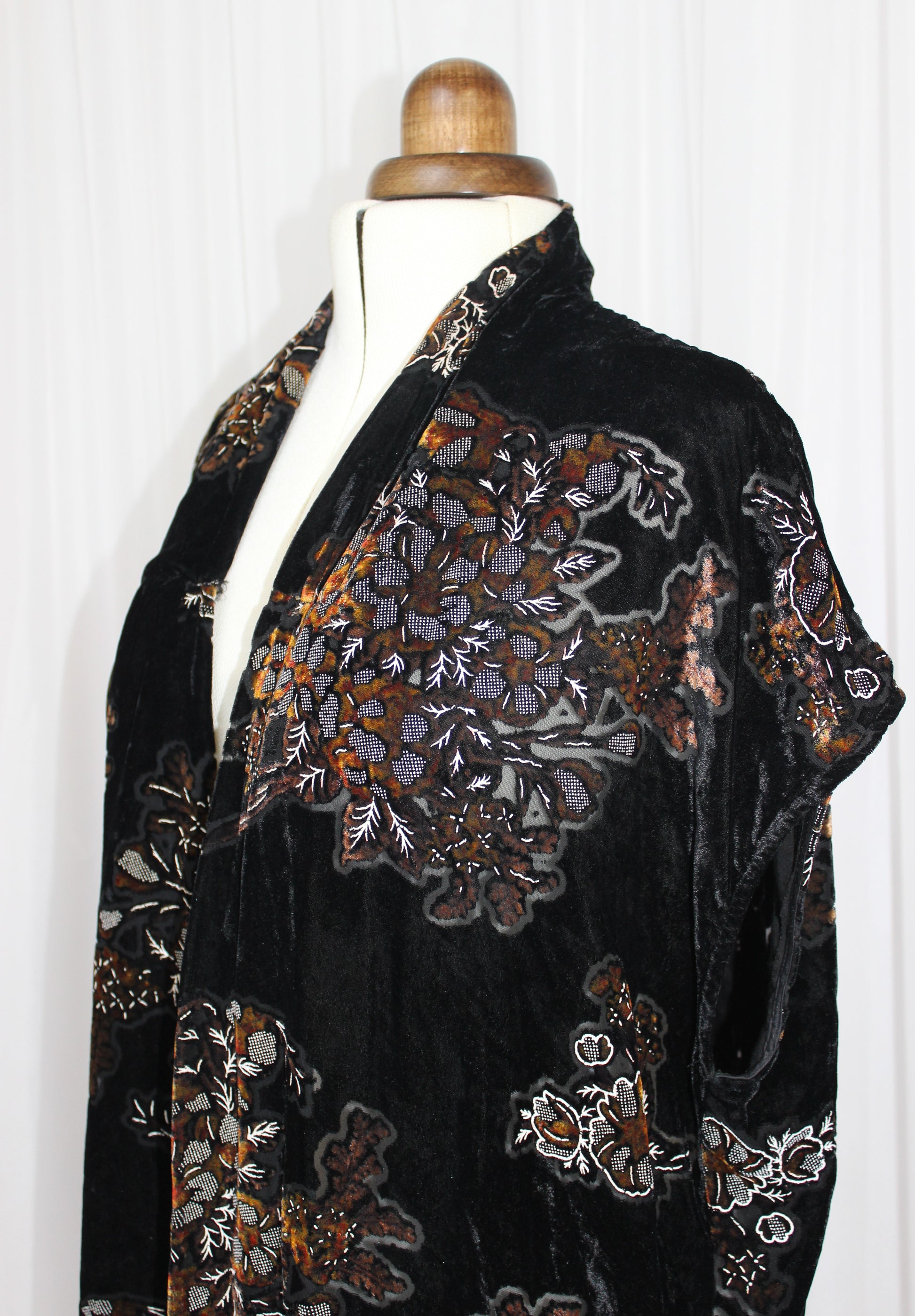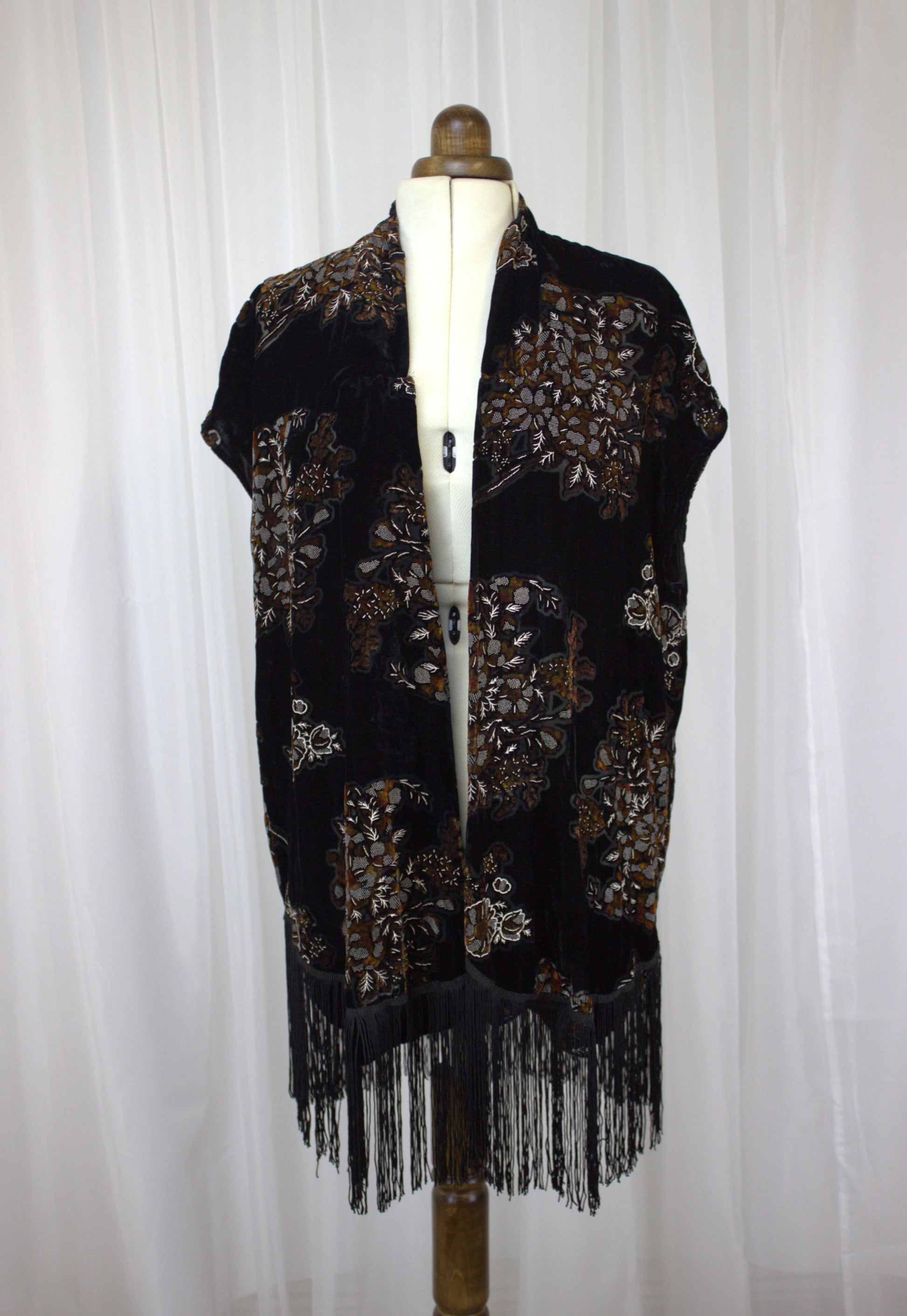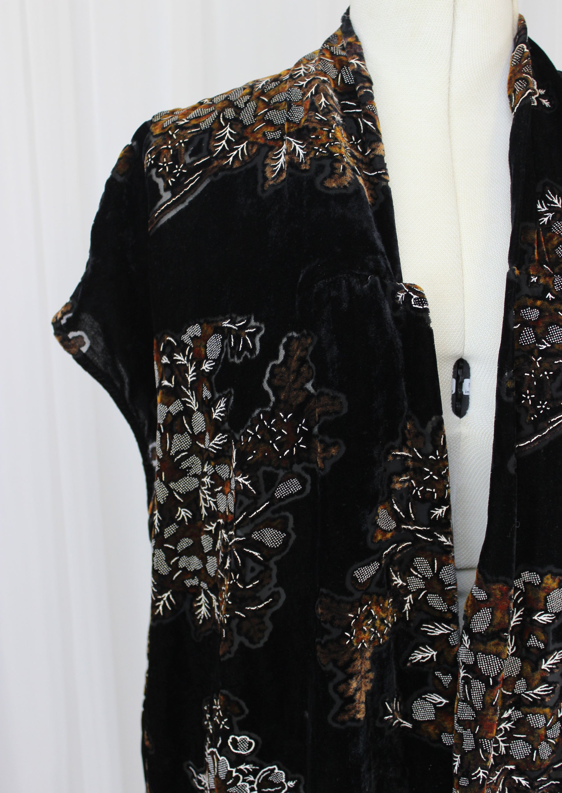 This unique Topshop kimono-style cardigan, in a UK size 8, is the perfect blend of elegance and boho charm. Featuring rich, autumnal colors on a luxurious black velvet base, it brings warmth and sophistication to any outfit.