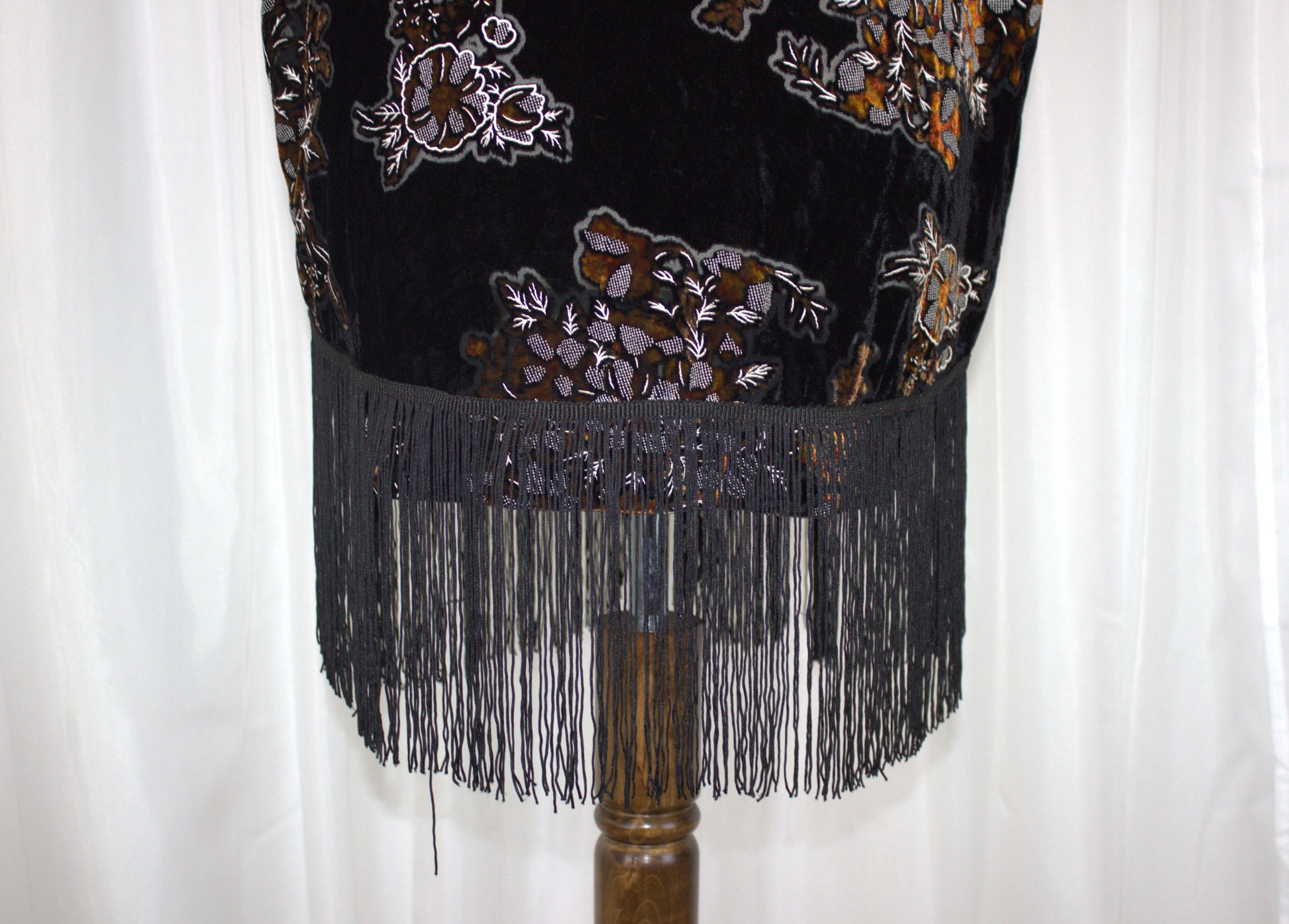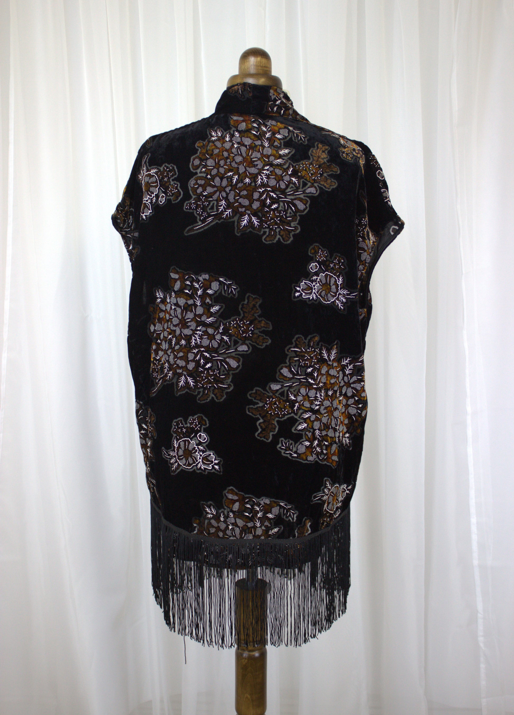 The intricate floral pattern is beautifully complemented by the fringe detailing along the hem, adding movement and a touch of vintage-inspired flair. Ideal for layering over simple tops or dresses, this piece is as versatile as it is eye-catching, making it a stunning choice for the season.