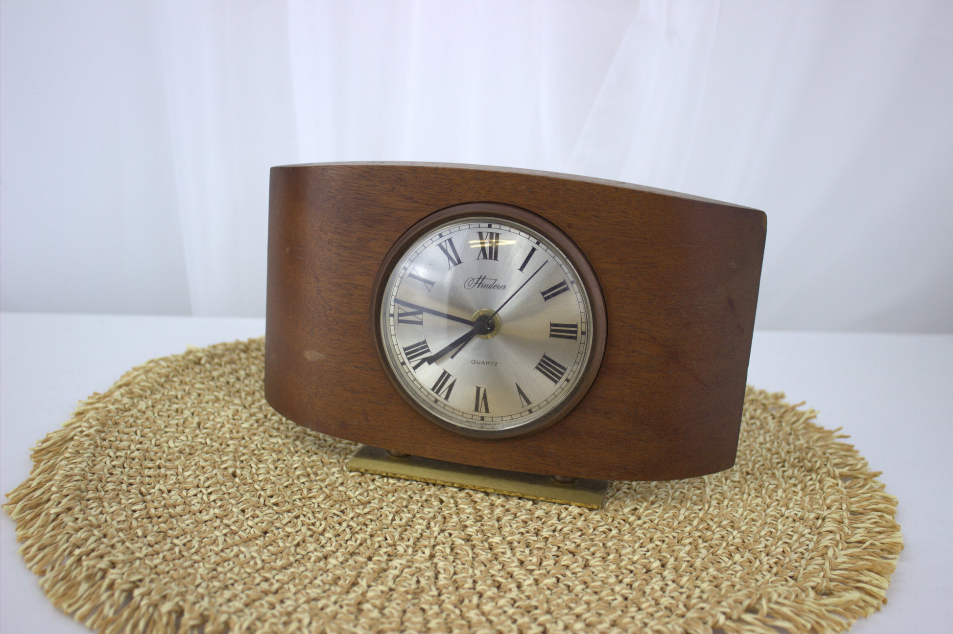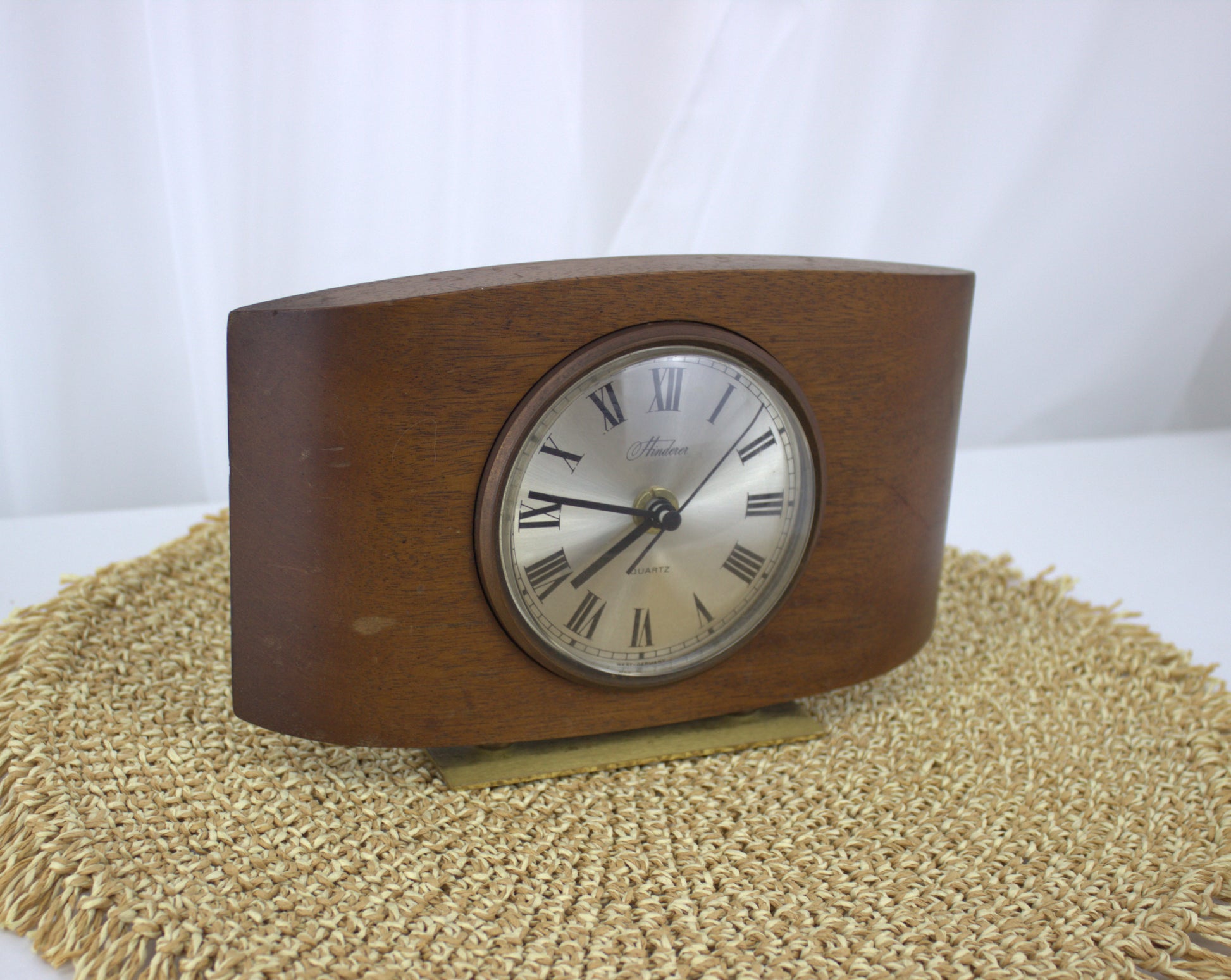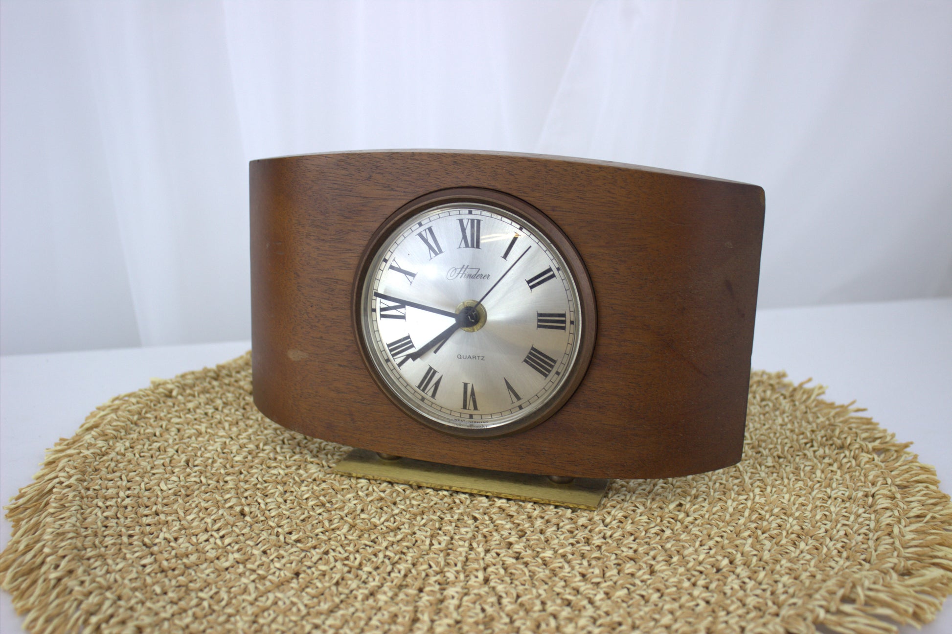 Add a touch of timeless elegance to your space with this beautiful vintage Hinderer mantle clock. Crafted with a rich wooden frame and a sleek brass stand, this clock combines mid-century charm with the reliable accuracy of quartz movement. The classic Roman numeral face and minimalist design make it a versatile piece that fits seamlessly into any decor style, from retro to modern. Perfect for a mantle, bookshelf, or desk, this clock is not just a timekeeper but a statement of style and history.
