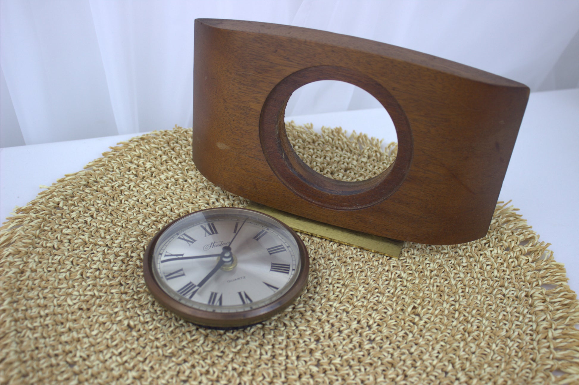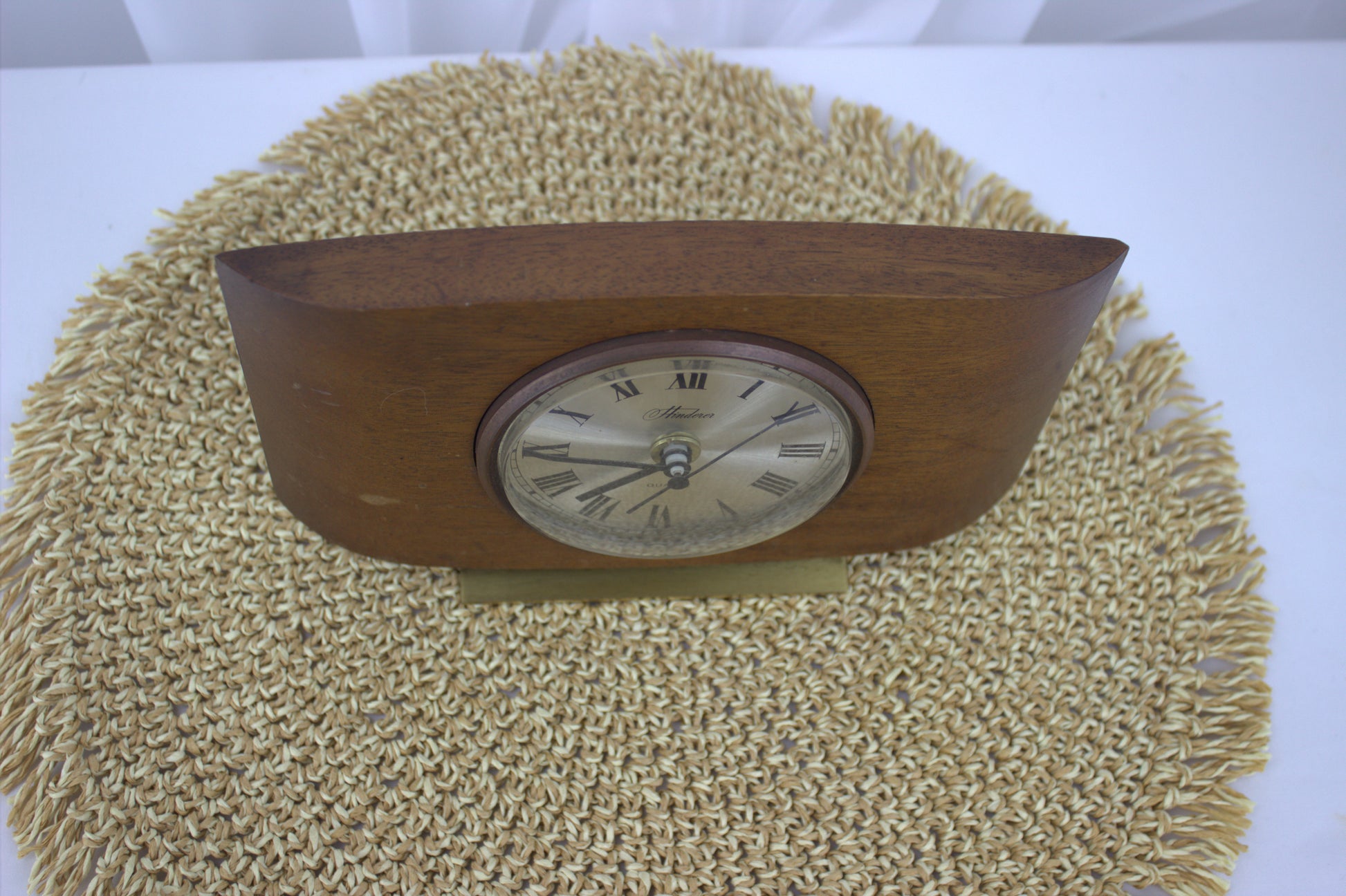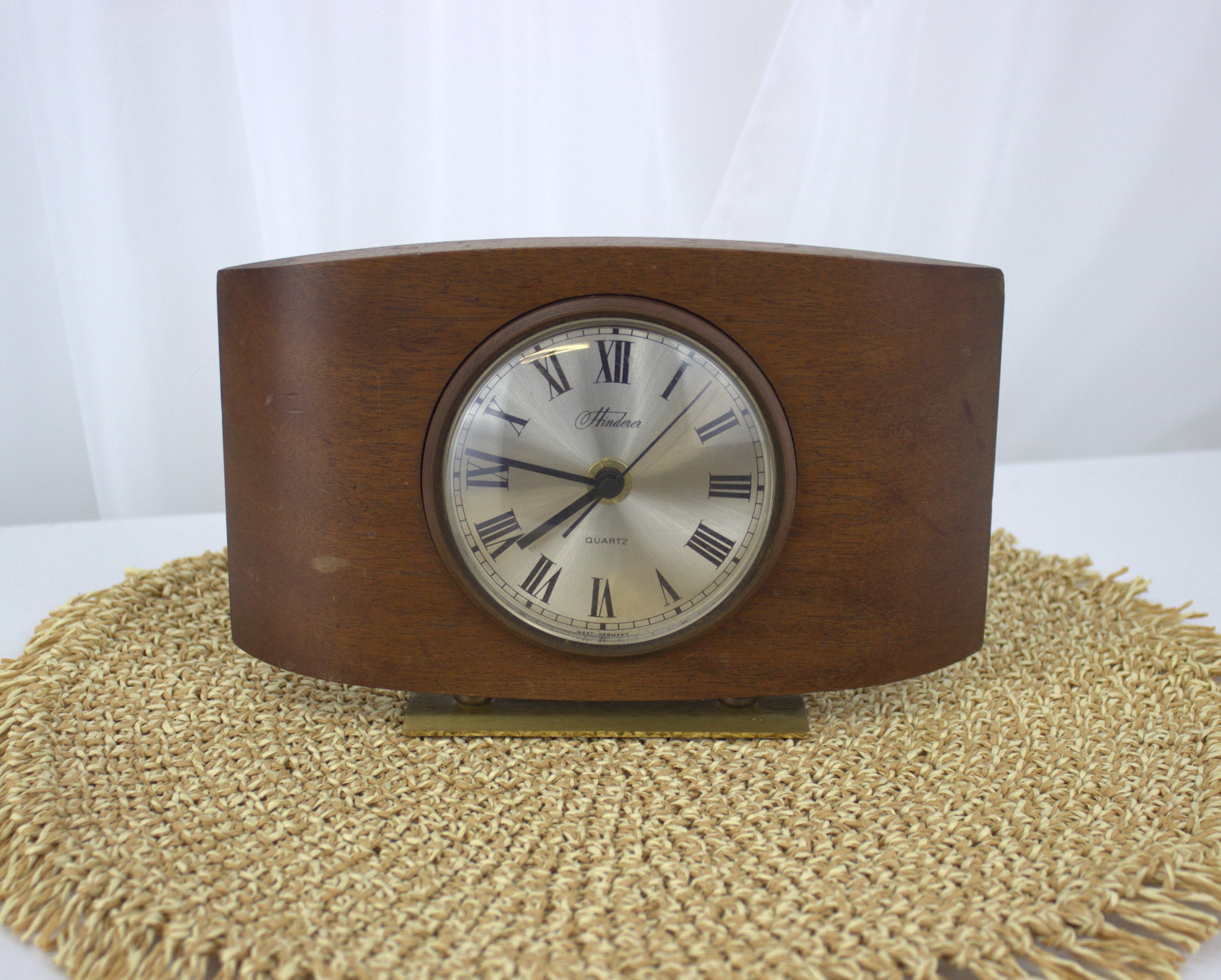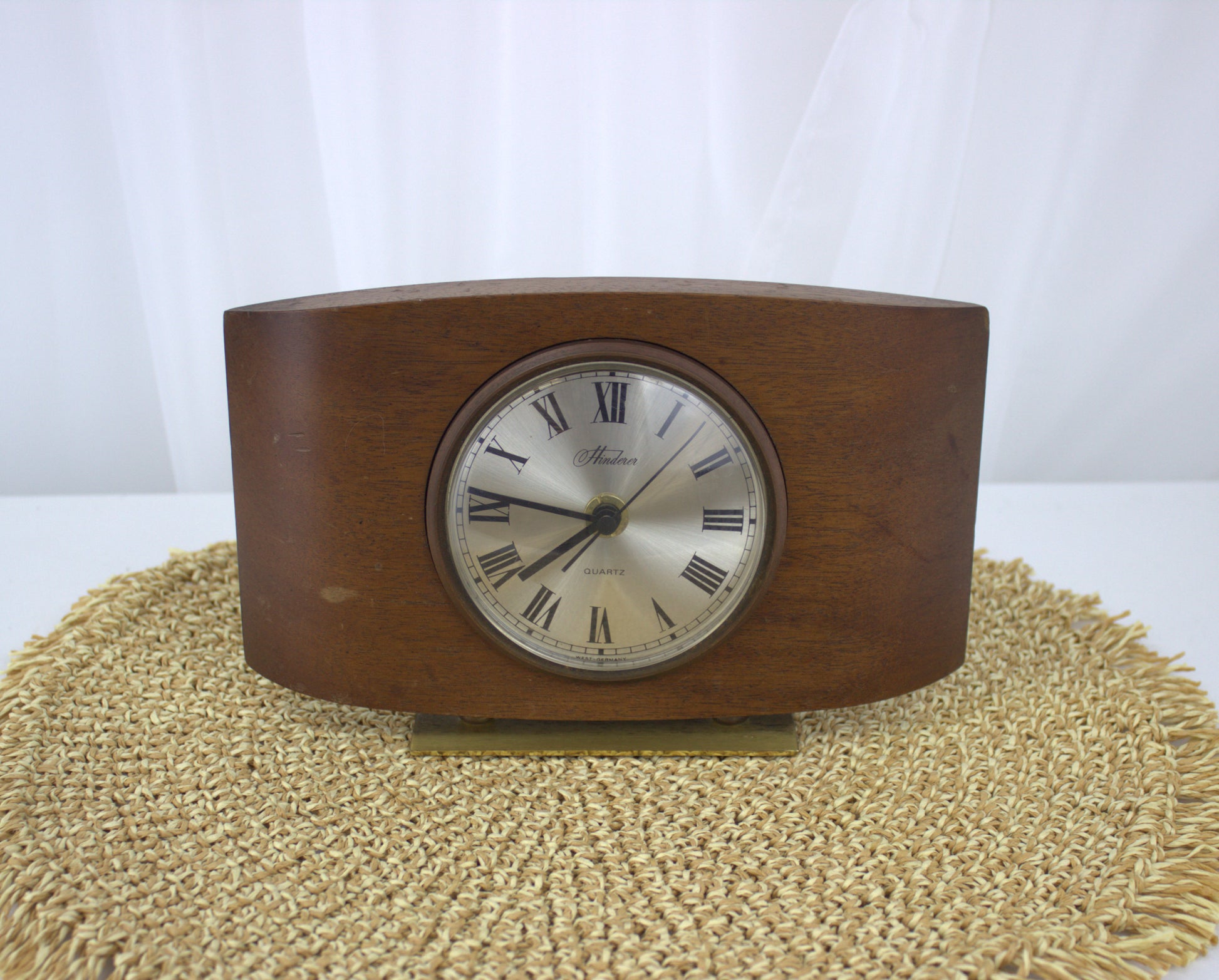 Add a touch of timeless elegance to your space with this beautiful vintage Hinderer mantle clock. Crafted with a rich wooden frame and a sleek brass stand, this clock combines mid-century charm with the reliable accuracy of quartz movement. The classic Roman numeral face and minimalist design make it a versatile piece that fits seamlessly into any decor style, from retro to modern. Perfect for a mantle, bookshelf, or desk, this clock is not just a timekeeper but a statement of style and history.