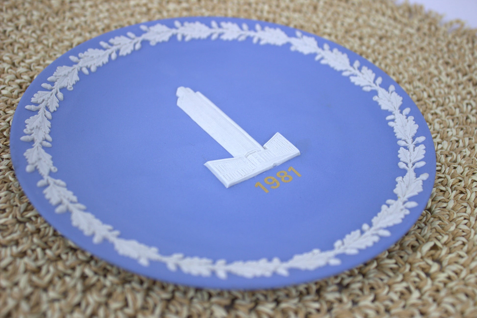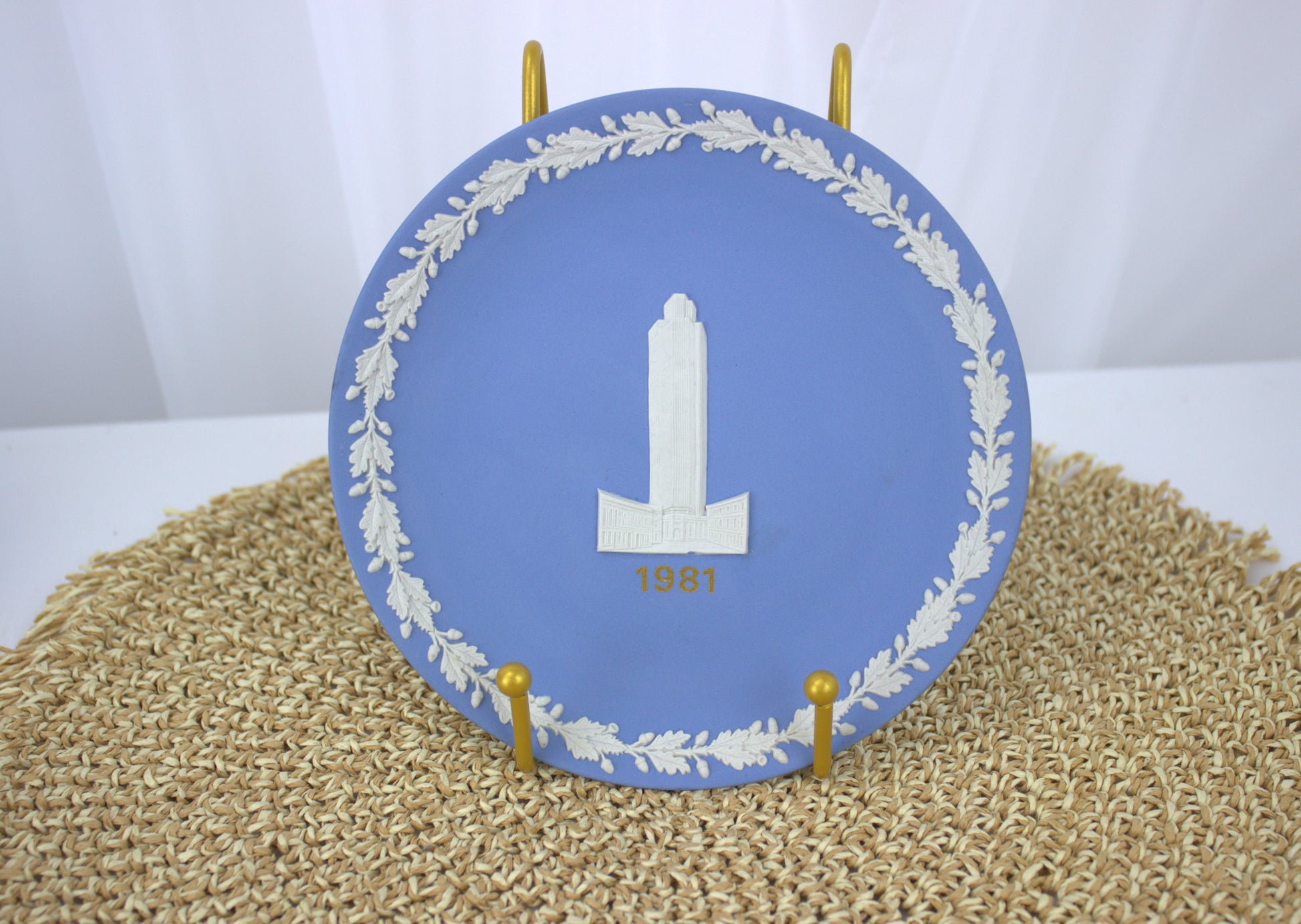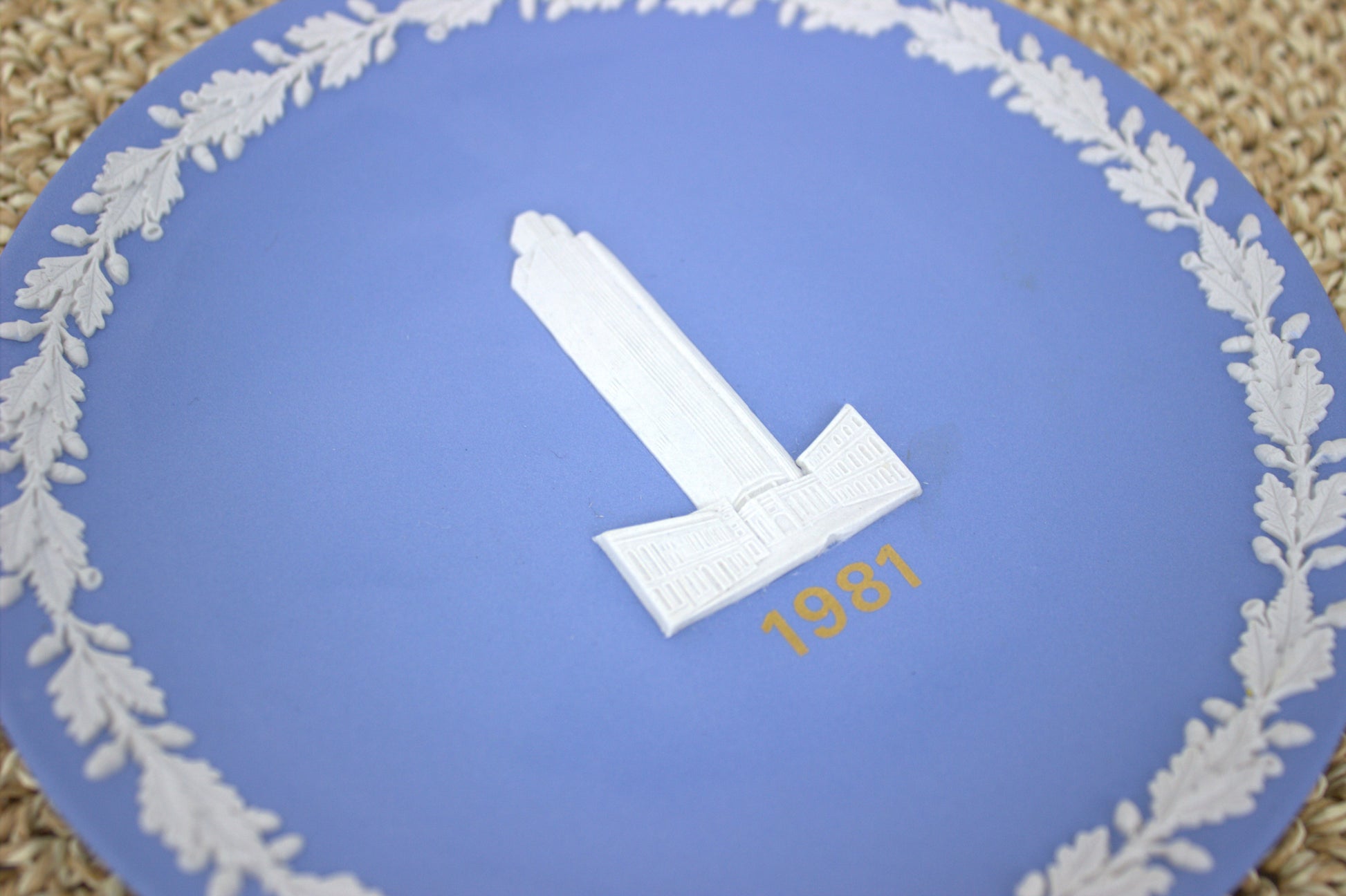 This elegant 1981 Wedgwood Jasperware plate commemorates the iconic National Westminster Tower, showcasing a beautiful white relief of the tower against the classic blue background that Wedgwood is renowned for.